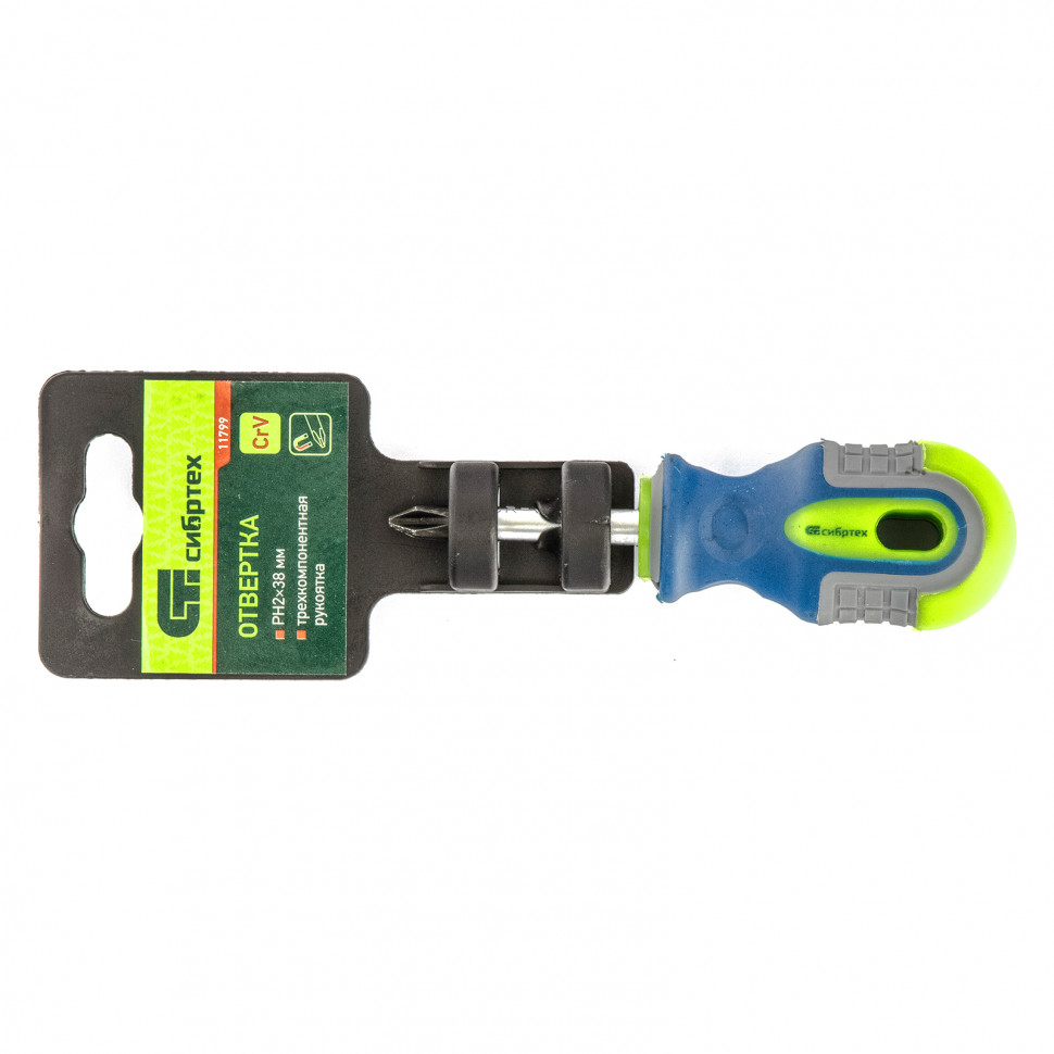 Отвертка Сибртех 11799, PH2 х 38 мм, из стали CrV, с 3-х компонентной рукояткой, пригодится частным мастерам для монтажа/демонтажа крепежных элементов типоразмера PH2. Она поможет произвести ремонтные и монтажные работы дома, в гараже, на даче. Благодаря стержню длиной 38 мм отверткой можно работать в ограниченном пространстве.
