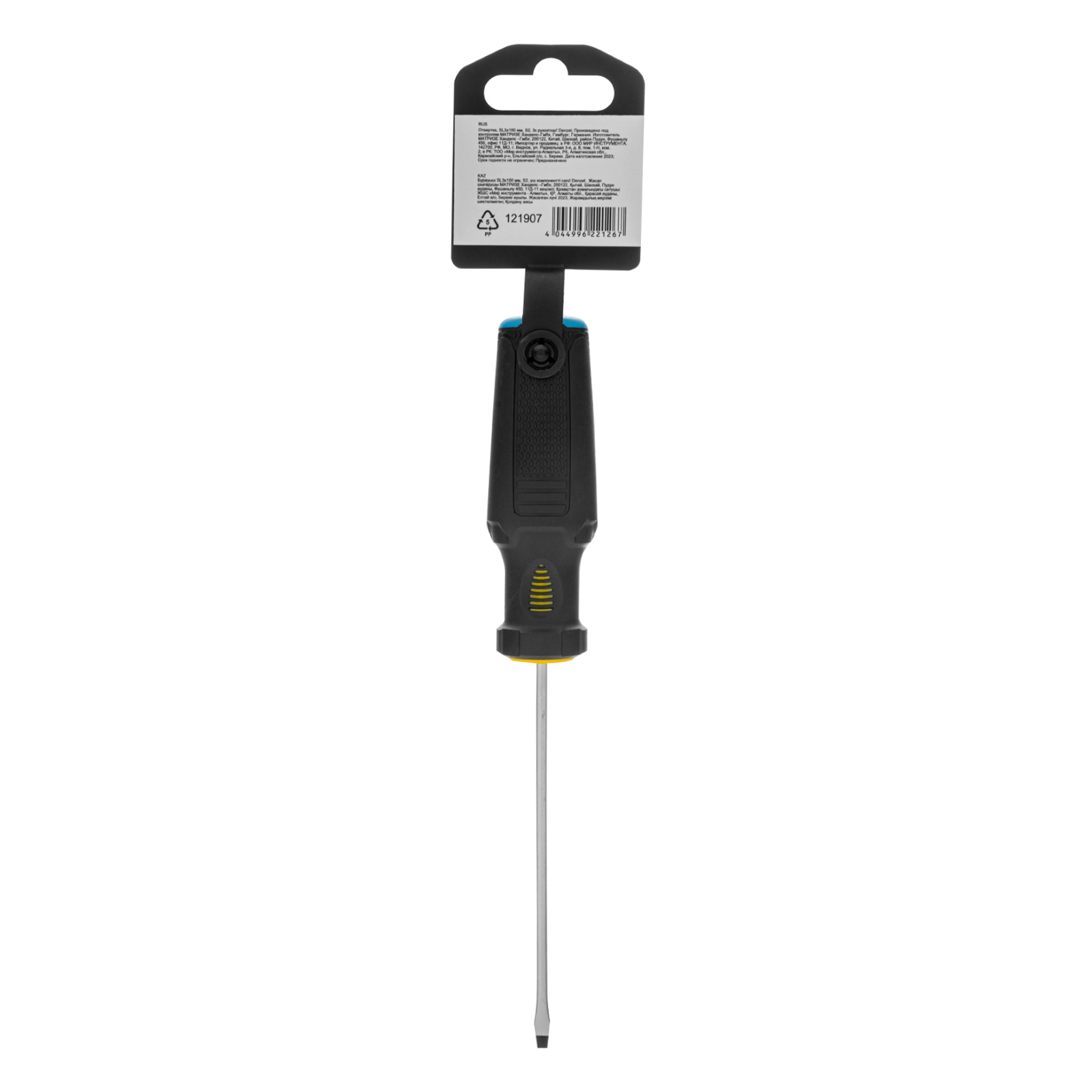 Отвертка Denzel 121907 с трехкомпонентной рукояткой, со стержнем из стали S2, длиной 100 мм, предназначена для монтажа и демонтажа винтов и саморезов с прямым шлицем SL3. Высокоточный намагниченный шлиц крепко фиксируется в головке крепежа. Отвертка выдерживает интенсивное применение, предназначена для выполнения профессиональных ремонтных и монтажных работ.