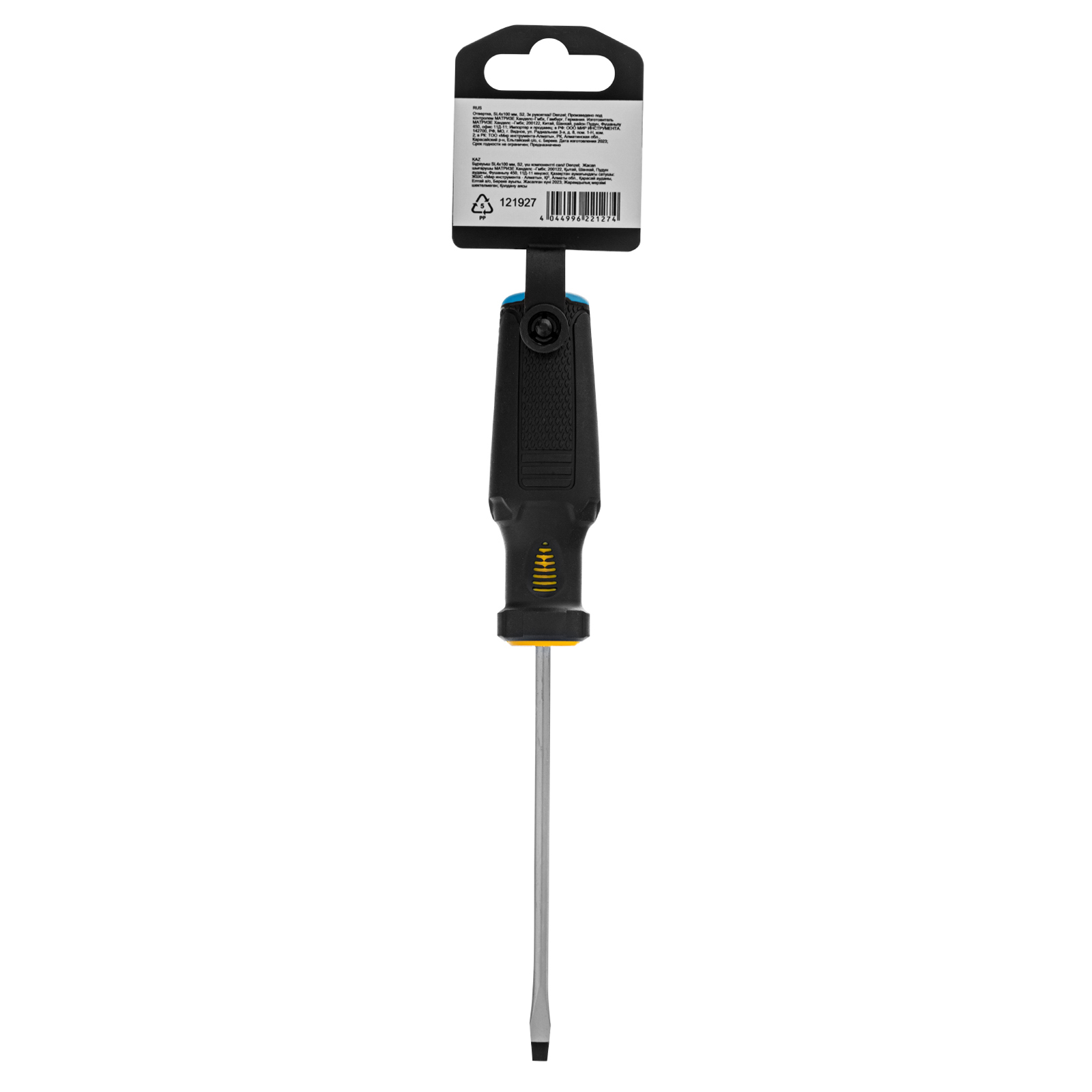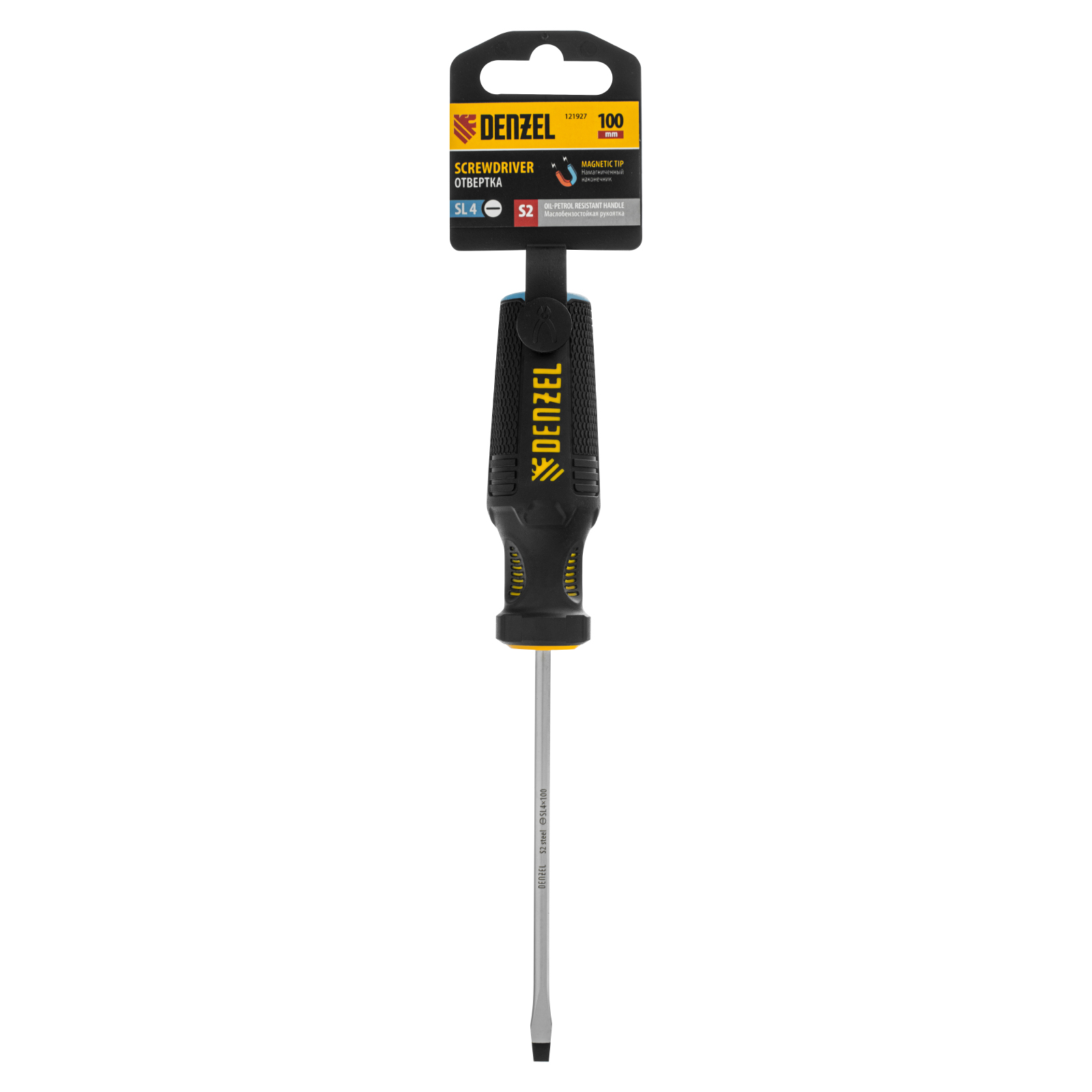 Отвертка Denzel 121927 с трехкомпонентной рукояткой, со стержнем из стали S2, длиной 100 мм, предназначена для монтажа и демонтажа винтов и саморезов с прямым шлицем SL4. Высокоточный намагниченный шлиц крепко фиксируется в головке крепежа. Отвертка выдерживает интенсивное применение, предназначена для выполнения профессиональных ремонтных и монтажных работ.