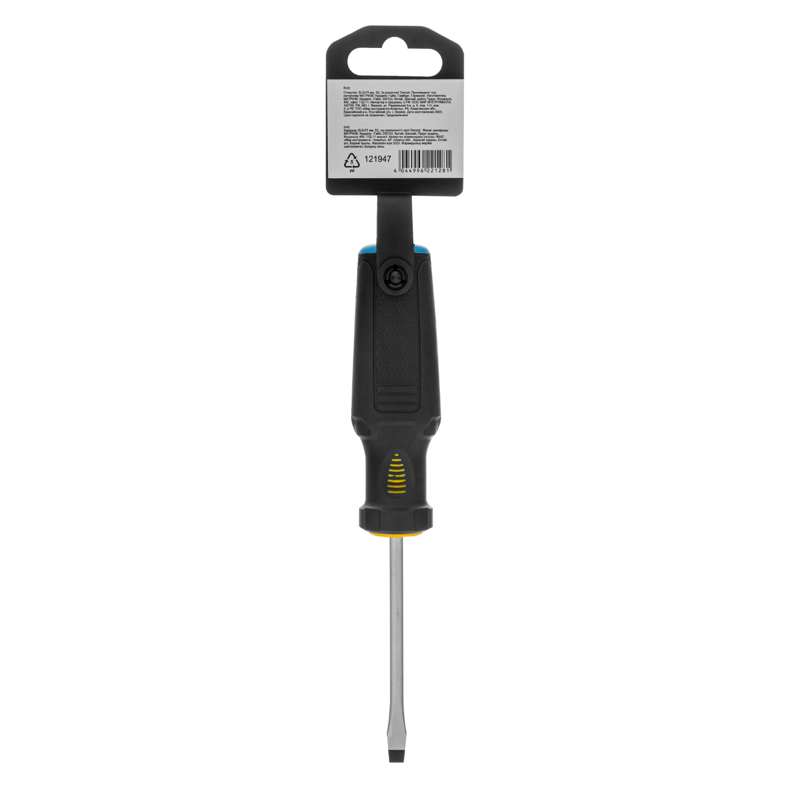 Отвертка Denzel 121947 с трехкомпонентной рукояткой, со стержнем из стали S5, длиной 75 мм, предназначена для монтажа и демонтажа винтов и саморезов с прямым шлицем SL5. Высокоточный намагниченный шлиц крепко фиксируется в головке крепежа. Отвертка выдерживает интенсивное применение, предназначена для выполнения профессиональных ремонтных и монтажных работ.