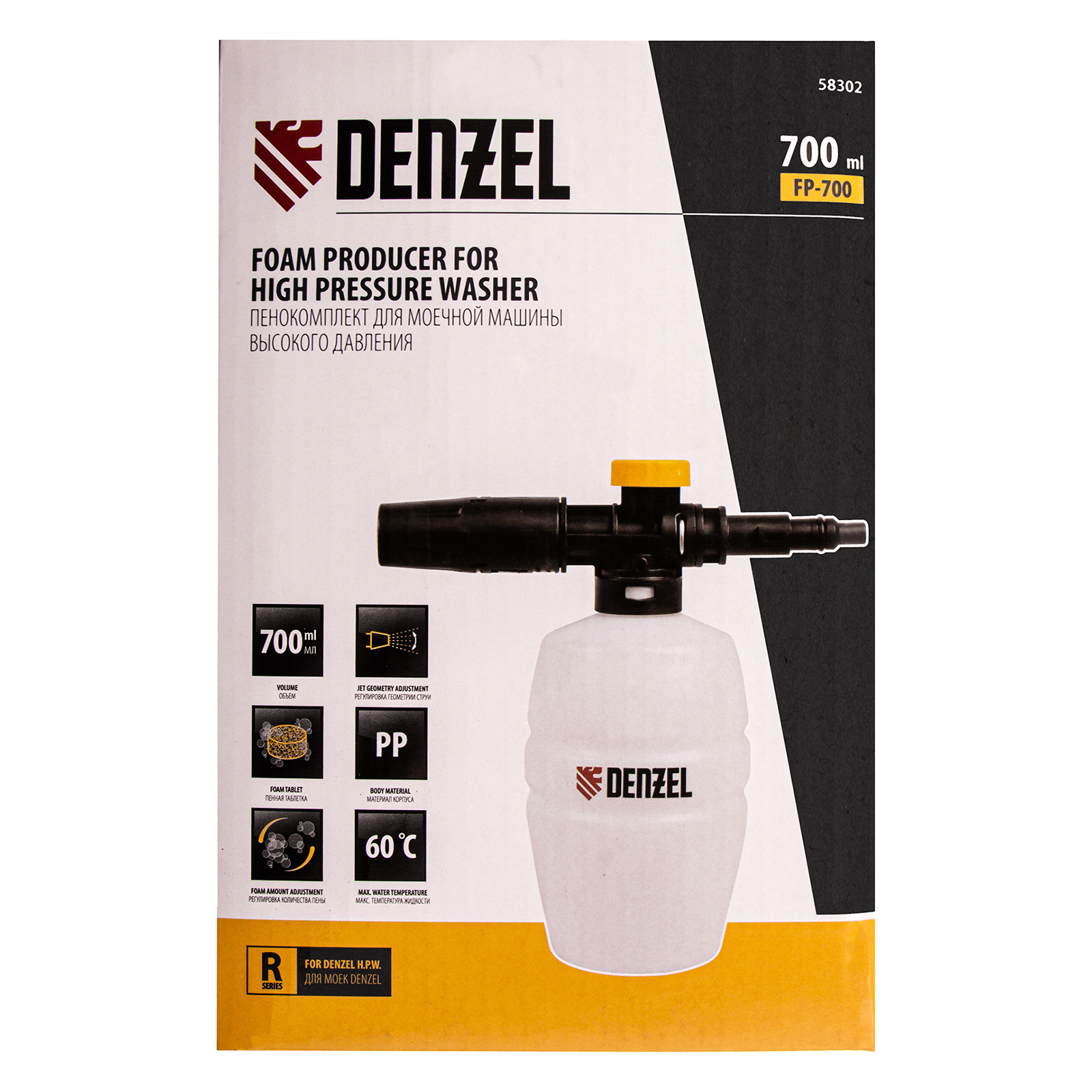 Универсальный пенокомплект Denzel FP-700 58302 совместим со всеми моечными машинами высокого давления Denzel серии R. Он формирует густую и активную пену для очищения различных поверхностей, в том числе кузова автомобиля.