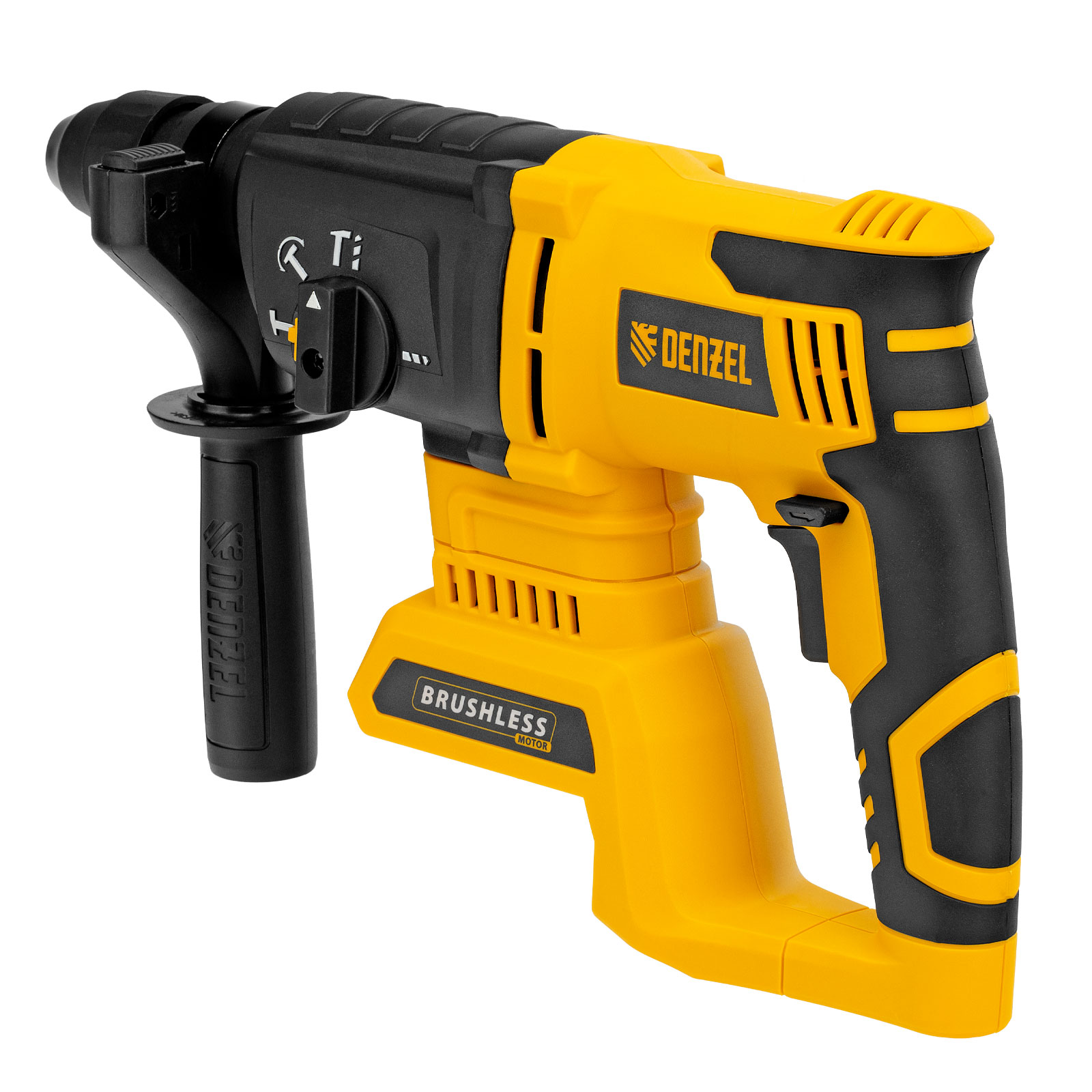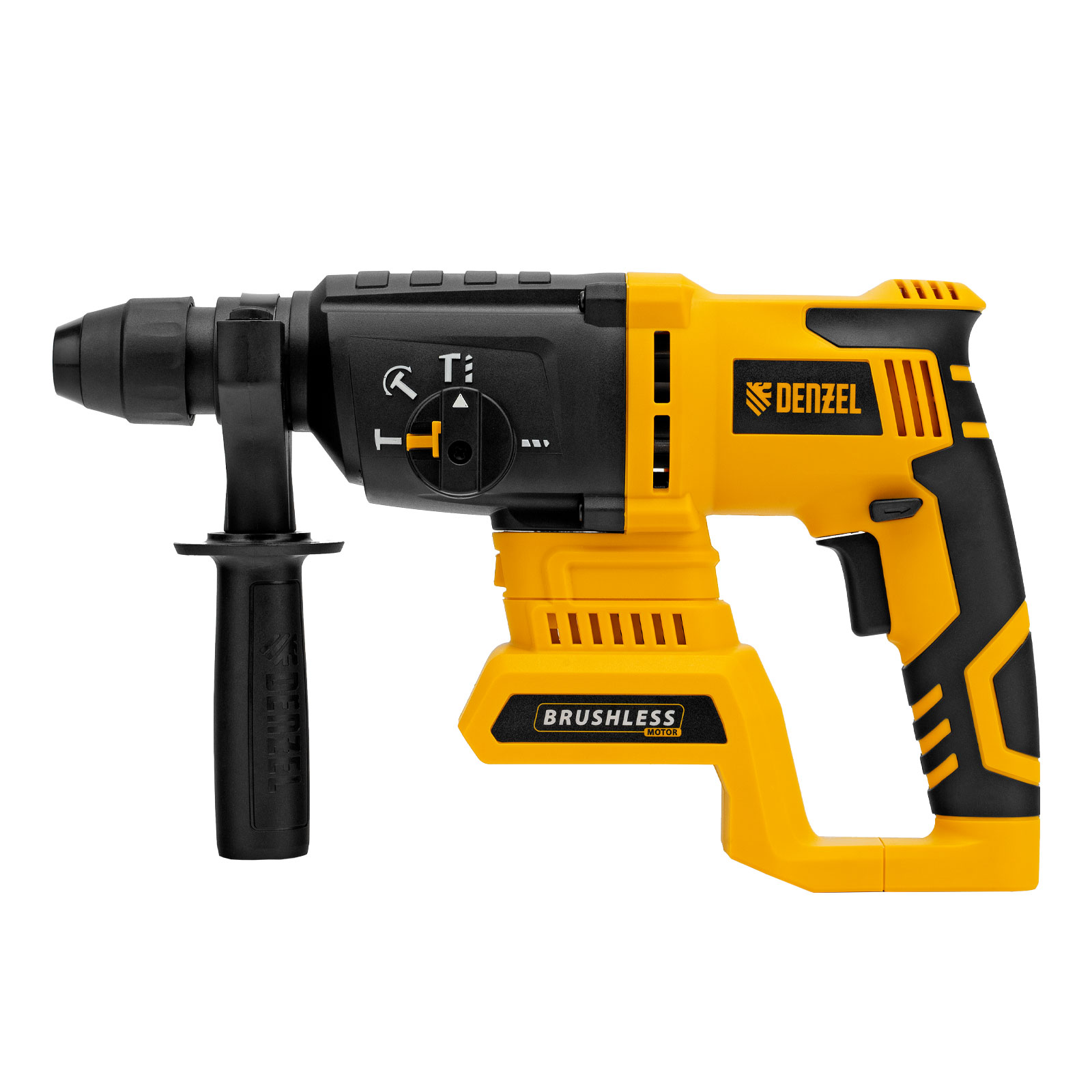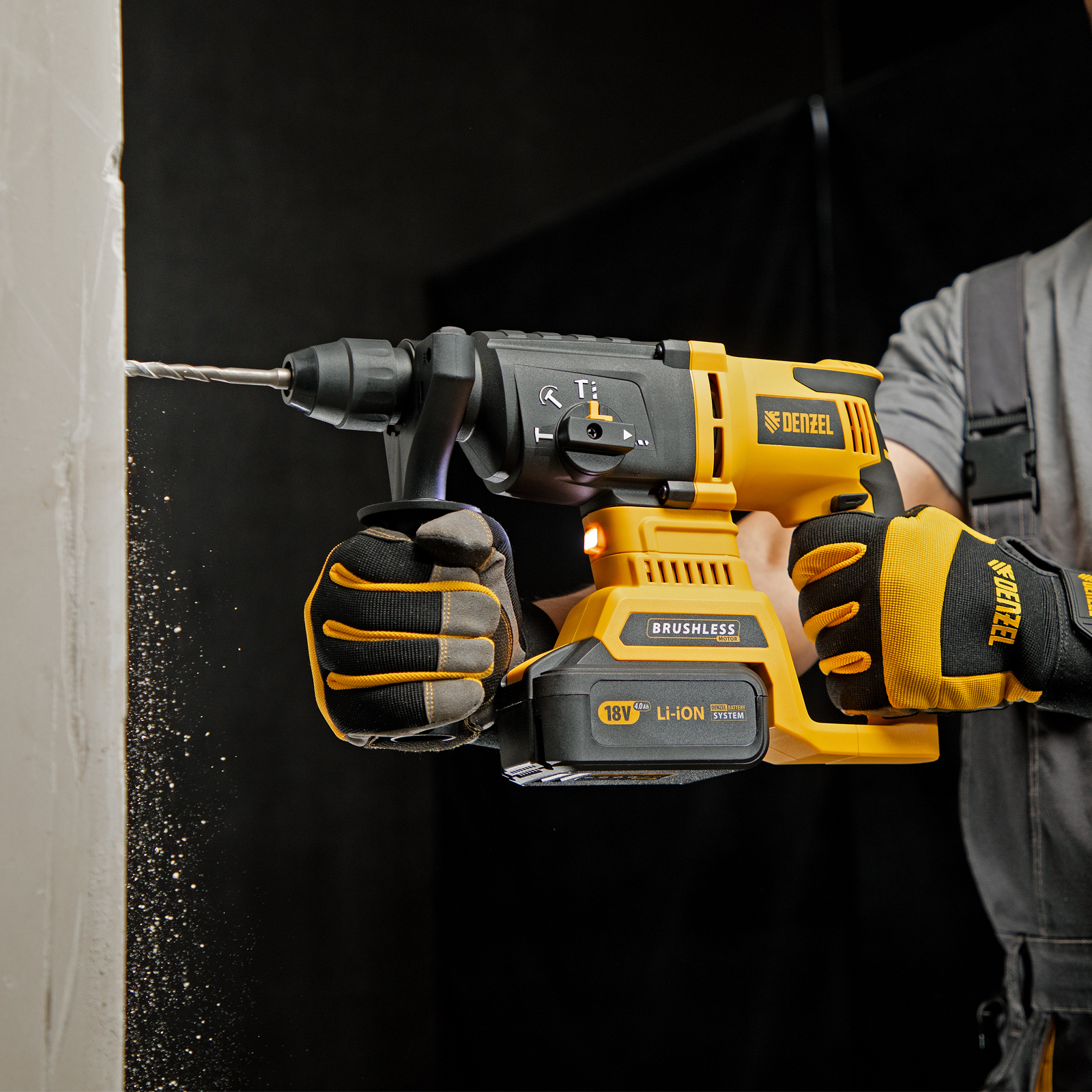 - Универсальность — к перфоратору подходит любой Li-Ion аккумулятор единой платформы Denzel Battery System 18V.
