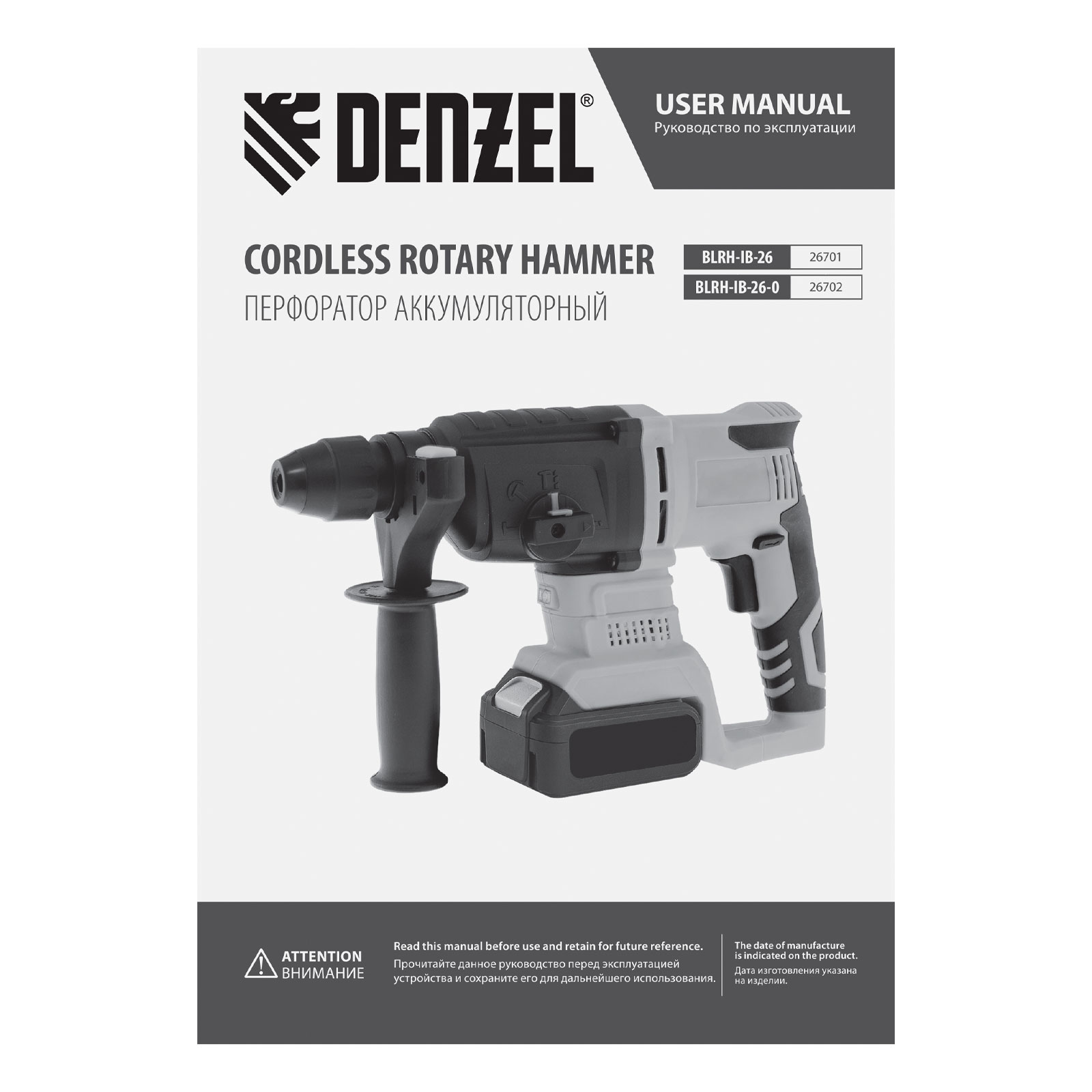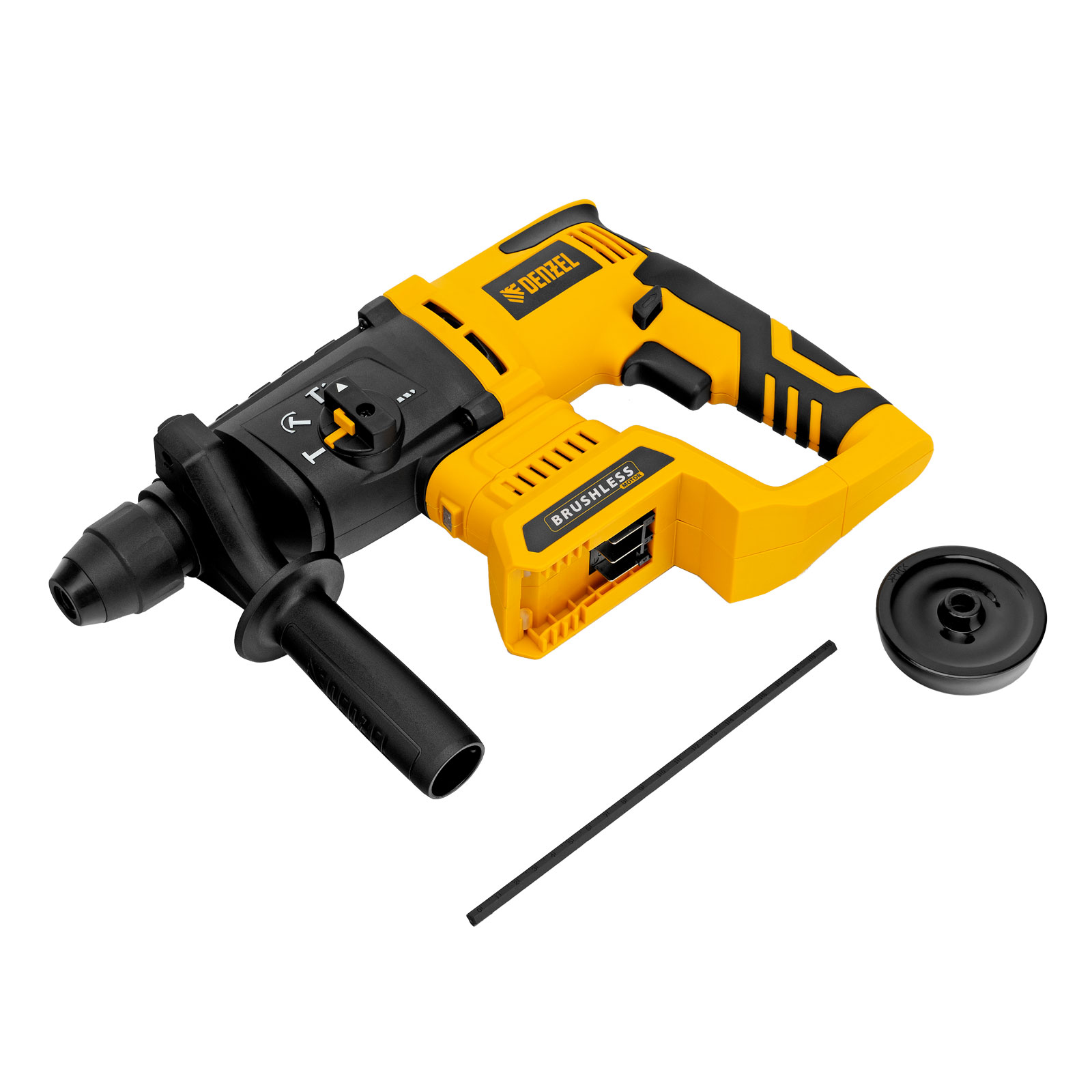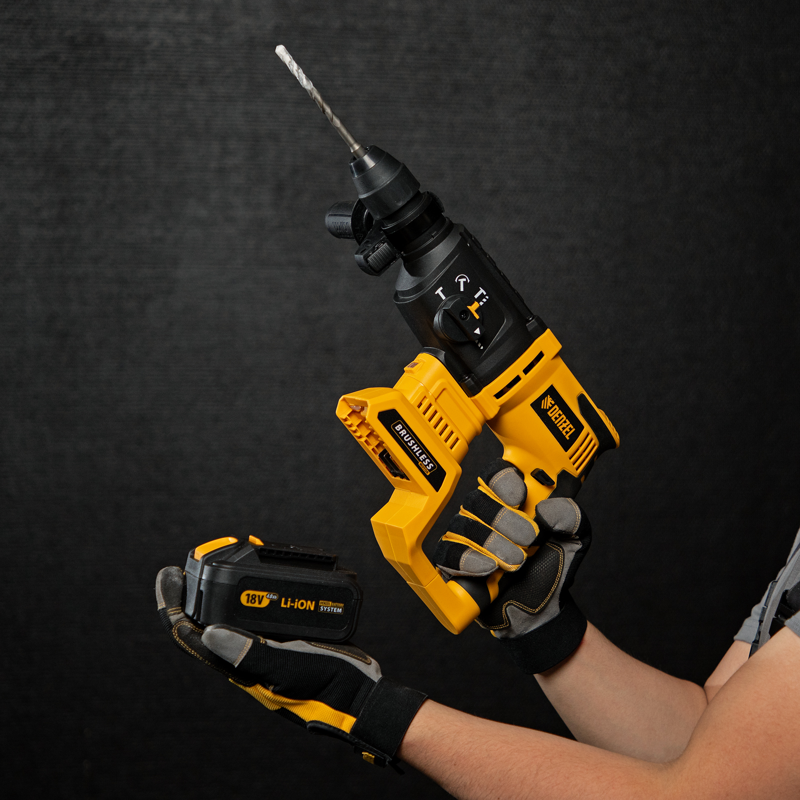 - Универсальность — к перфоратору подходит любой Li-Ion аккумулятор единой платформы Denzel Battery System 18V.