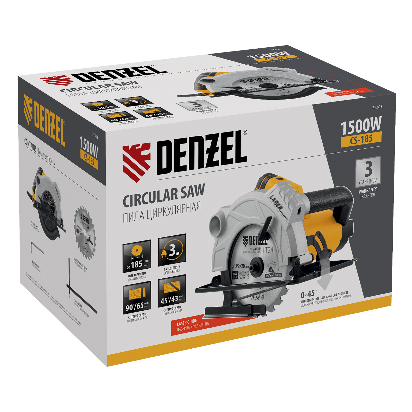 Циркулярная пила Denzel CS-185 27303 мощностью 1500 Вт с пильным диском диаметром 185 мм предназначена для раскроя фанеры, быстрого прямого реза листового материала на основе древесины, ДСП и ДВП.,Двигатель мощностью 1,5 кВт обеспечивает частоту вращения пильного диска 5800 об/мин. Высокая скорость работы позволяет выполнять более аккуратные и ровные срезы в сравнении с менее быстрыми аналогами. С помощью специального рычага легко регулировать глубину пропила от до 65 мм.