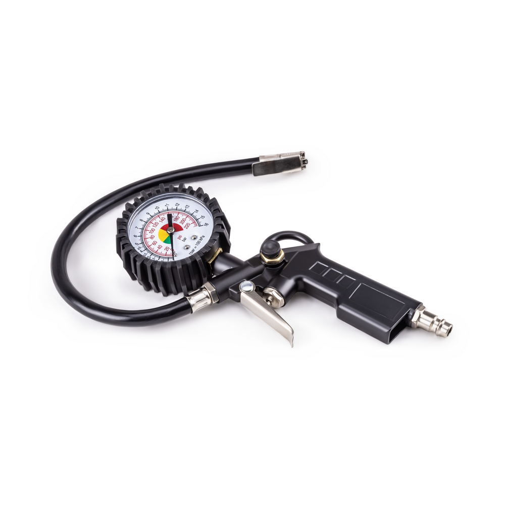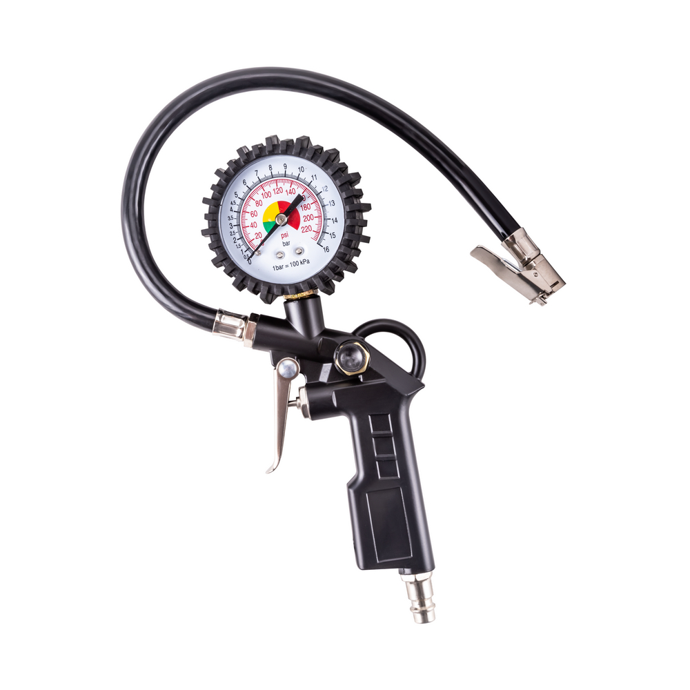 Пневматический пистолет для подкачки шин с манометром — это инструмент предназначенный для увеличения и регулировки давления в шинах. Может применяться как в частном гараже, так и в автосервисах и шиномонтажных мастерских. Также данный пистолет можно использовать в качестве продувочного инструмента для очистки деталей и поверхностей. Пневматический пистолет оснащен кнопкой стравливания воздуха и манометром с двойной шкалой, что дает возможность контролировать давление в шинах во время подкачки. Пистолет имеет гибкий морозоустойчивый шланг 30 см, который позволяет производить работы в узких и труднодоступных местах. Данный пистолет для подкачки шин рекомендуем использовать со шлангом AERO.