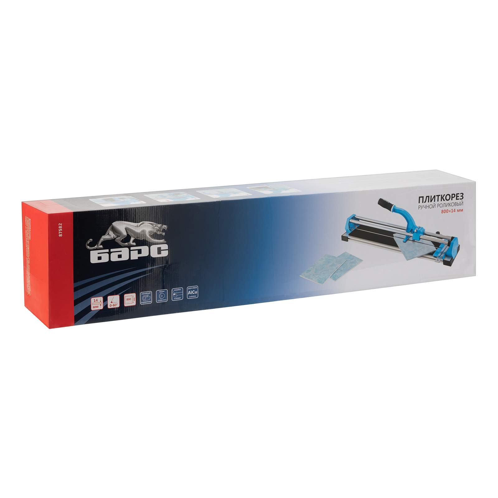 Плиткорез ручной Барс 87582 с кареткой на подшипниках, усиленной рукояткой и облегченной алюминиевой станиной, предназначен для резки плитки из кафеля и керамогранита длиной до 800 мм и толщиной до 14 мм. Благодаря регулируемому боковому упору удобен для серийной резки. Инструмент подходит для бытового и профессионального использования, оптимален для выполнения больших объемов облицовочных работ.