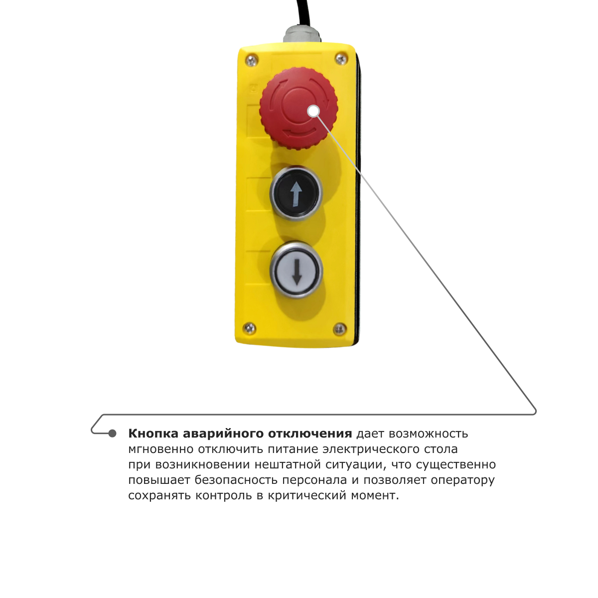 Минимальная высота стола составляет 220 мм. Уровень необходимой высоты подъема устанавливается с пульта управления с кнопками подъема, спуска и экстренного отключения. PROLIFT M2 HIW 3.0EU оснащен надежным электрогидравлическим приводом, работающим от сети.