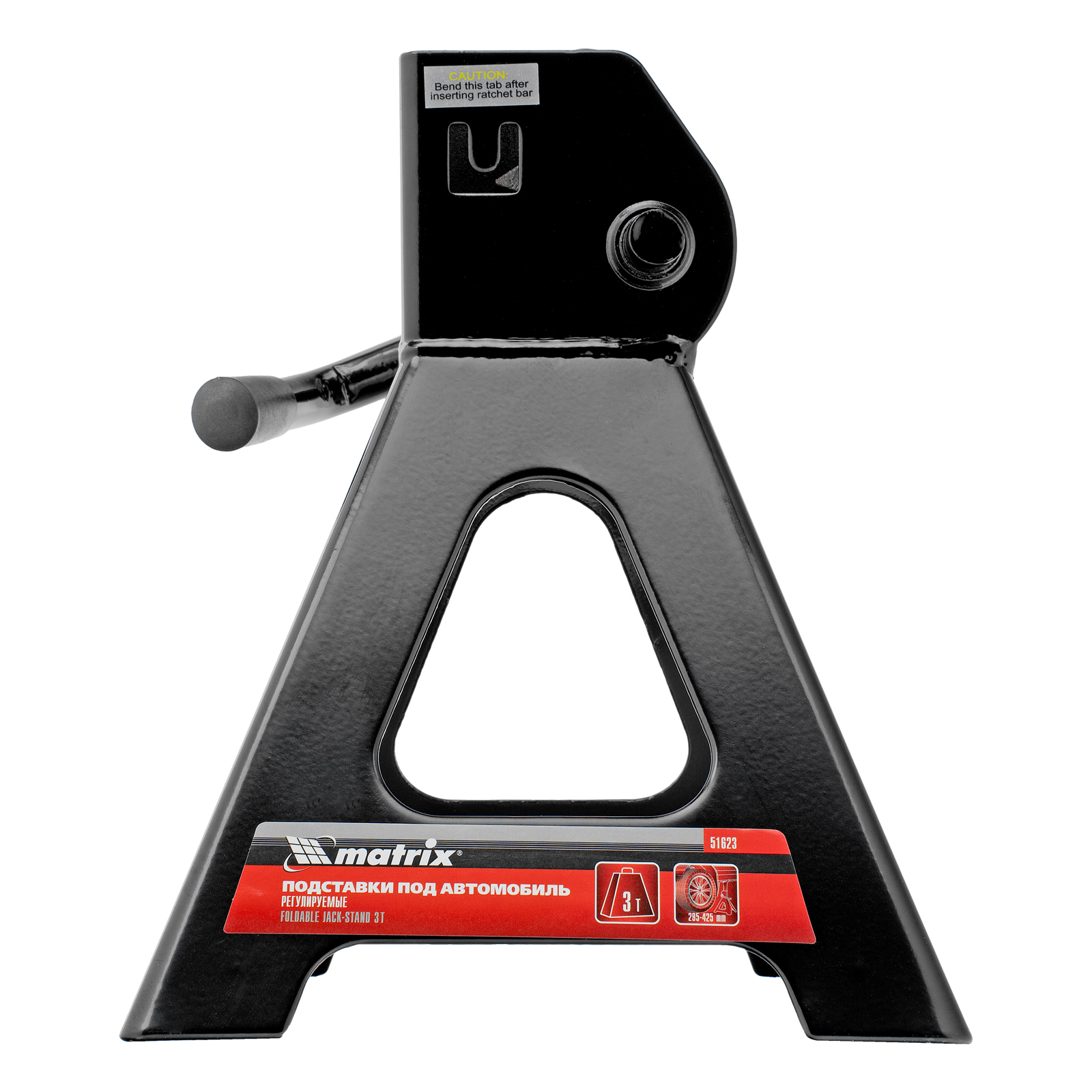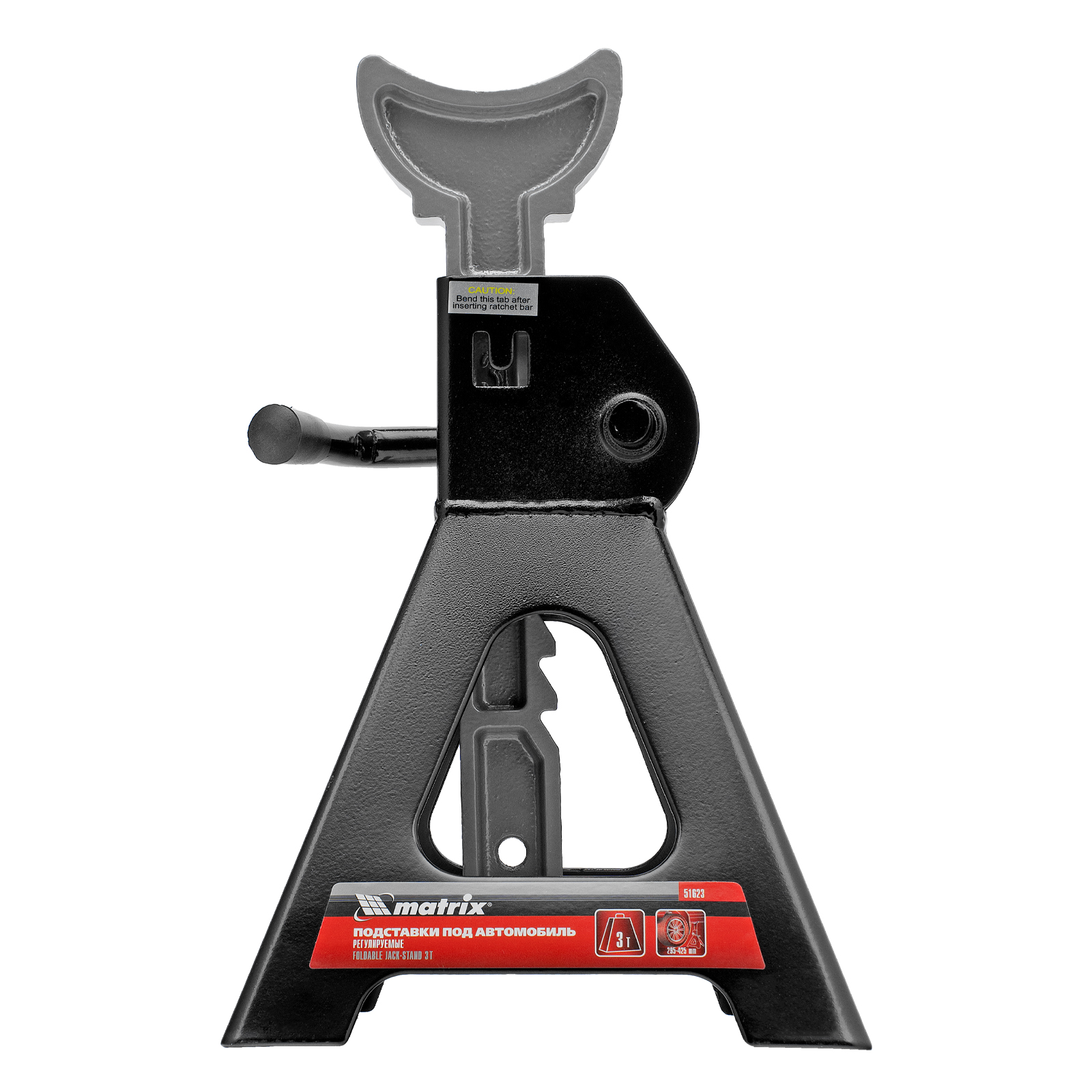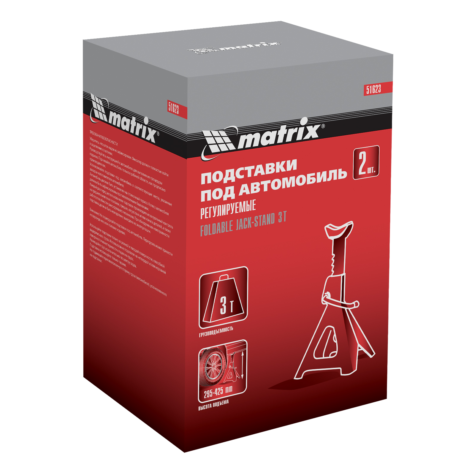Регулируемые подставки под автомобиль Matrix 51623 с несущей способностью 3 т, 2 шт. в комплекте, удерживают груз на высоте 295-425 мм. Их используют в качестве средства дополнительной фиксации и страховки легкового автомобиля, поднятого на подъемнике или домкрате. Конструкцией предусмотрен зубчатый механизм, надежно удерживающий шток в выдвинутом положении. Подставки пригодятся в гараже или автосервисе во время проведения ремонтных работ.