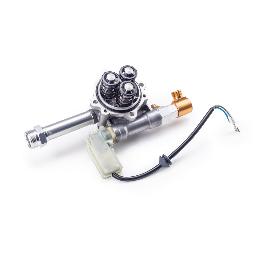 Помпа высокого давления для моек KVAZARRUS K5 Standart, K5 Expert  является ключевым рабочим узлом мойки высокого давления и отвечает за нагнетание потока воды под высоким давлением за счет обратно-поступательного движения трех поршней осуществляемого с помощью аксиального приводного механизма косой шайбы. Корпус помпы изготовлен из высококачественного алюминия, а ее напорный патрубок из латуни, что гарантирует дополнительную надежность и устойчивость к окислению. Помпа отличается высокими основными рабочими параметрами по давлению и производительности. Напорный патрубок из латуни имеет встроенный инжектор для подсоса моющего средства в режиме низкого давления. Также имеется система "AUTOSTOP" которая представляет собой интегрированный манометрический выключатель моментально отключающий электродвигатель при достижении максимального давления в системе после отпускания клавиши на пистолете, благодаря чему исключается его холостой ход, что обеспечивает экономию потребляемой электроэнергии и минимизирует нагрев электродвигателя, а также снижает износ уплотнительных элементов помпы, что способствует увеличению рабочего ресурса аппарата.