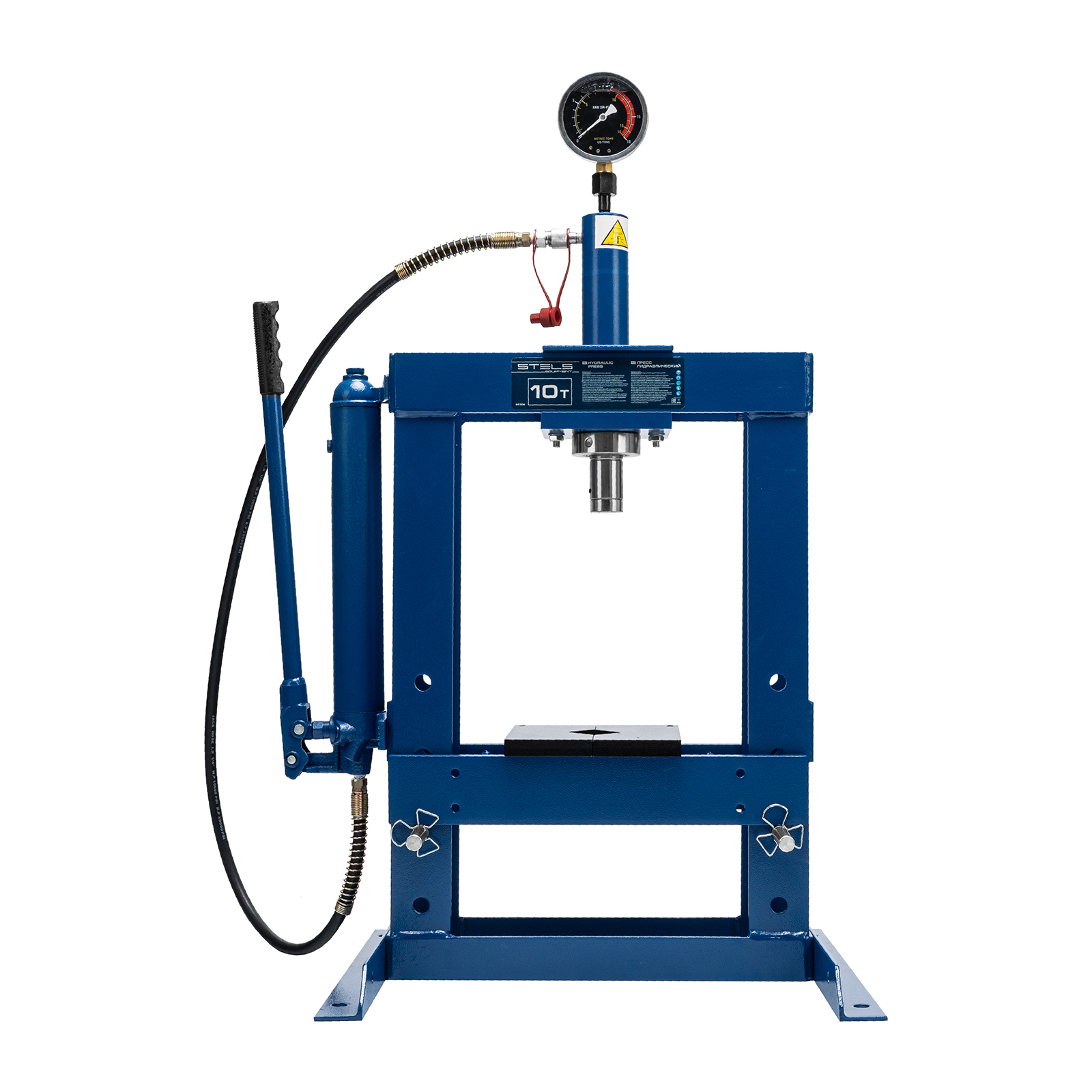 Гидравлический настольный пресс Stels 52305 с манометром, развивающий усилие до 10 тонн, — оборудование для запрессовки и выпрессовки деталей, например, подшипников, втулок, сайлентблоков, рычагов, штифтов. Фиксируется на столе — в опорах имеются отверстия для крепежа. Отличается плавным ходом штока благодаря высокому качеству исполнения гидронасоса и самого штока. Величину прилагаемого усилия можно контролировать при помощи глицеринозаполненного манометра. Пресс пригодится в автомастерской или личном гараже.