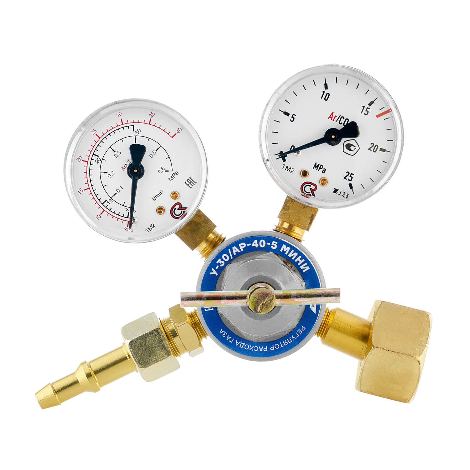 Регулятор расхода газа У-30/АР-40-5 МИНИ с манометрами для углекислоты и аргона предназначен для понижения давления газа и автоматического поддержания постоянным заданного расхода при питании постов и установок в среде защитных газов.