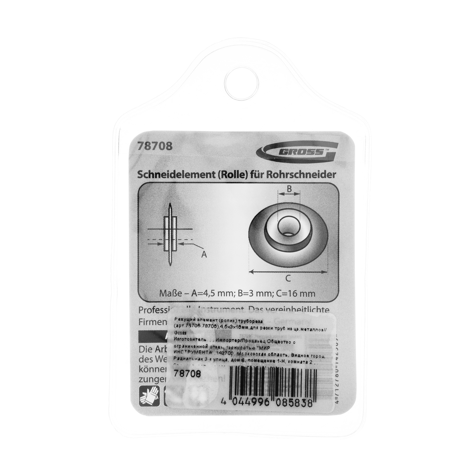 Режущий элемент, ролик трубореза для артиколов 78705, 78706, 4.5 х 3 х 16 мм, для резки труб из цветных металлов Gross в Воронеже