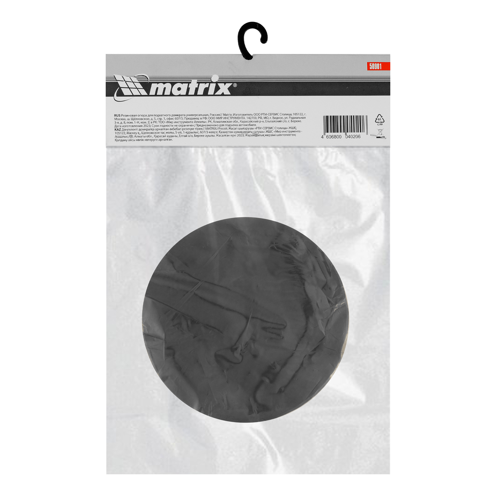Универсальная резиновая опора Matrix 50901 устанавливается на подкатной домкрат для снижения риска повреждения кузова и днища автомобиля, а также верхней части самого домкрата. Она пригодится водителям и автомеханикам в ходе проведения ремонтных работ. Подходит к артикулам 510105, 51035, 51045.