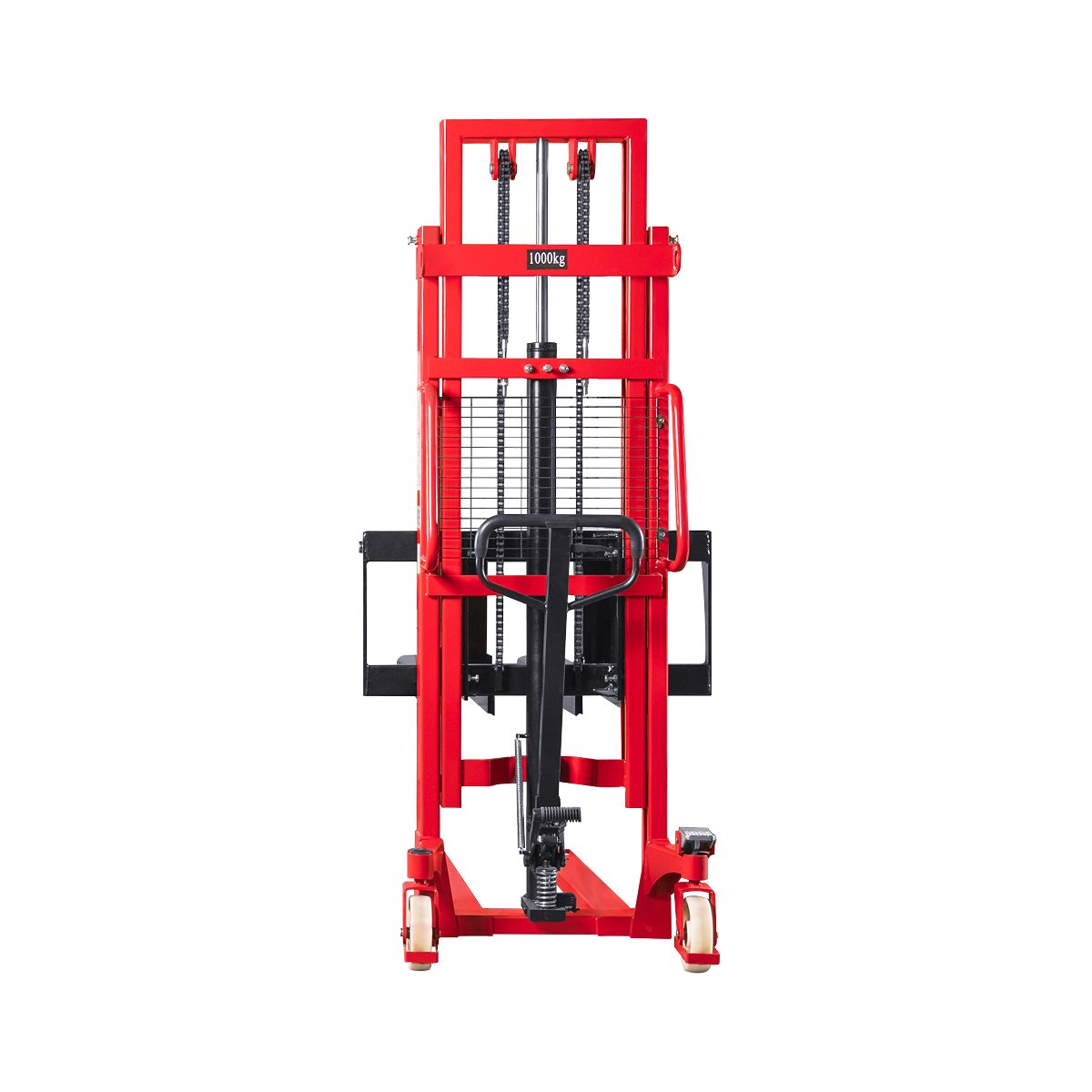 С заботой о безопасности оператора, на штабелере установлена защитная металлическая сетка. С целью повышения комфорта работы, на штабелере имеется курок для опускания вил, педаль для спуска и дополнительная ножная педаль, а рукоять управления имеет прорезиненное покрытие.