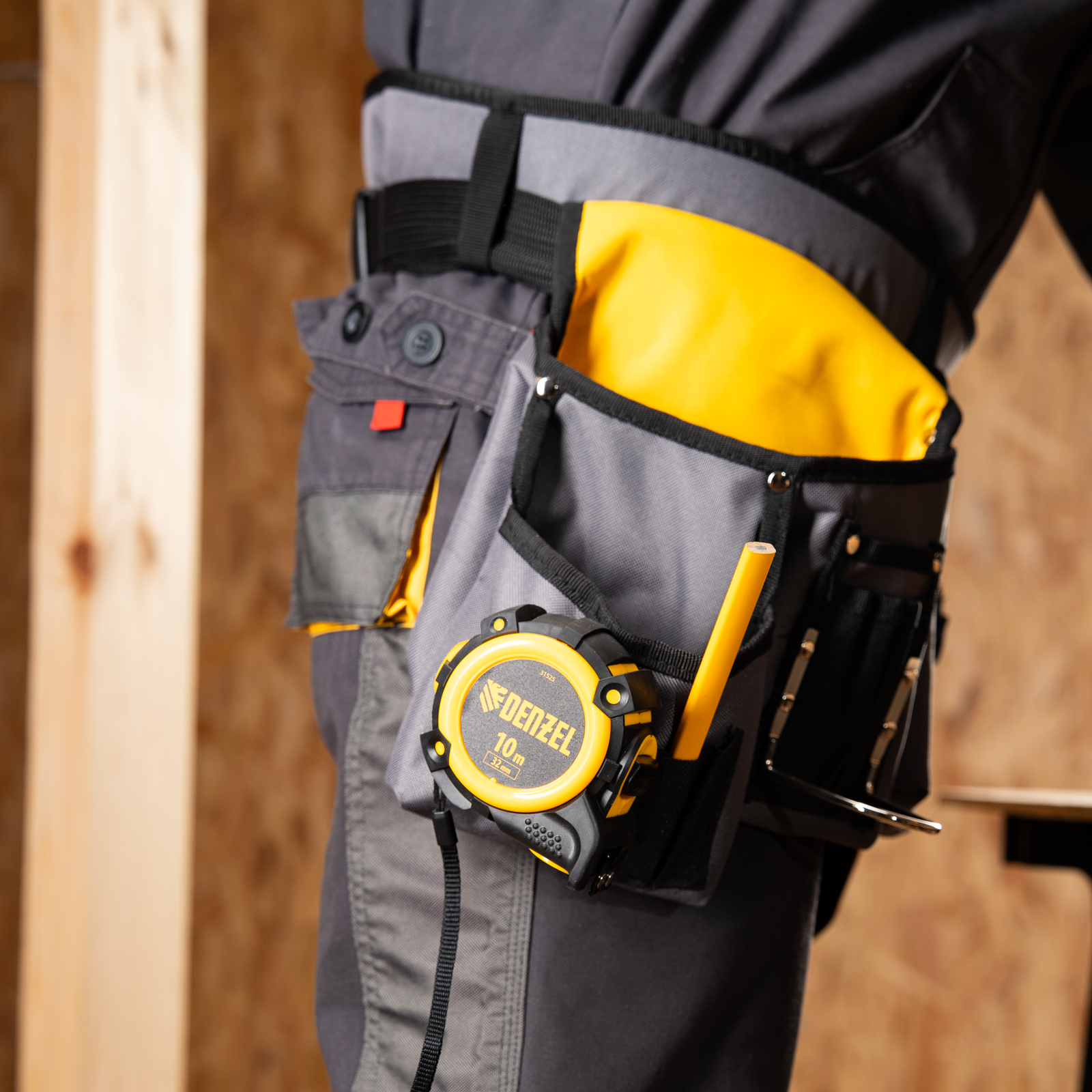 Рулетка Denzel 31525 с автоматической фиксацией полотна размером 10 м х 32 мм, с нейлоновым покрытием, магнитным зацепом и двухсторонней разметкой, предназначена для измерения расстояний и определения габаритов различных предметов. Лента автоматически фиксируется в вытянутом положении, что упрощает работу. Рулетка удобна для работы в труднодоступных местах, будет полезна во время строительных и ремонтных работ.