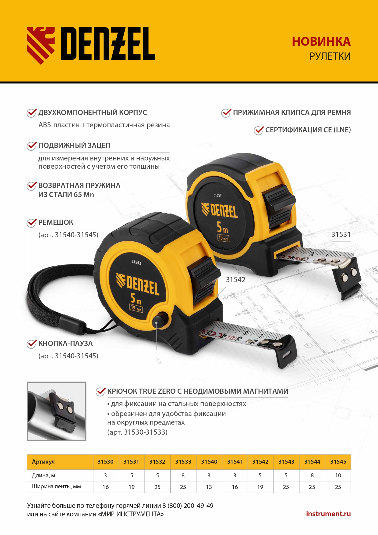 - Удобная эксплуатация — дополнительная клавиша-фиксатор удерживает ленту в вытянутом положении, облегчая проведение измерений.