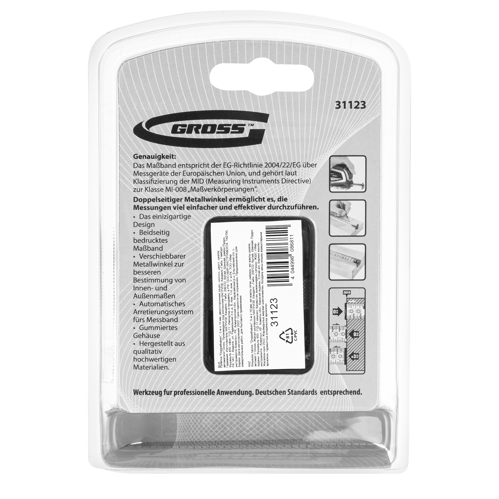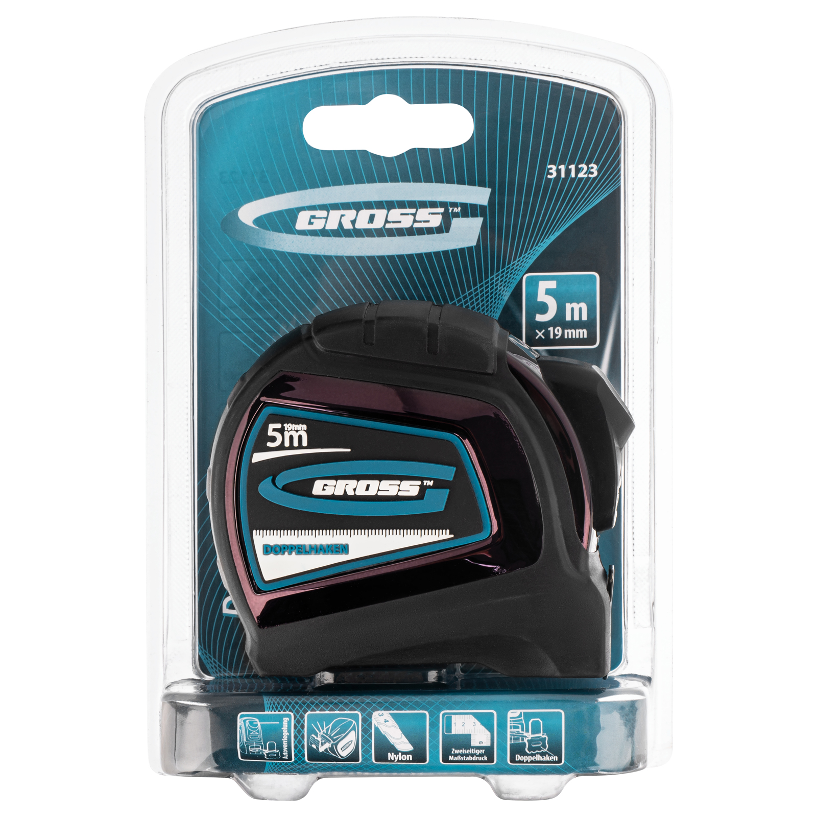 Автоматическая рулетка Gross «Doppelhaken» 31123 с двухсторонним зацепом, лентой размером 5 м x 19 мм, с двухсторонней шкалой и нейлоновым покрытием, предназначена для проведения измерений стен, полов, различных материалов и конструкций. Пригодится на строительной площадке и в быту.