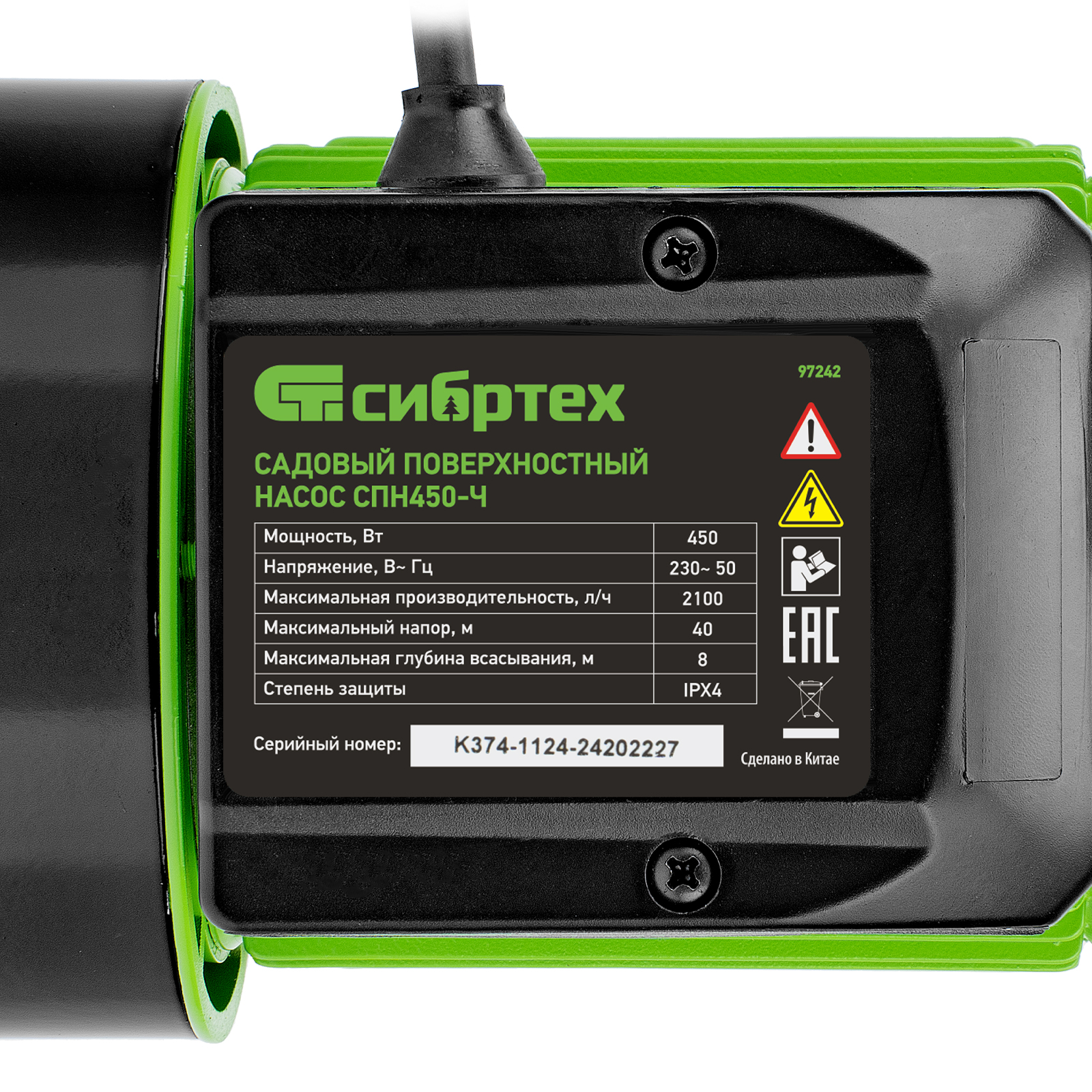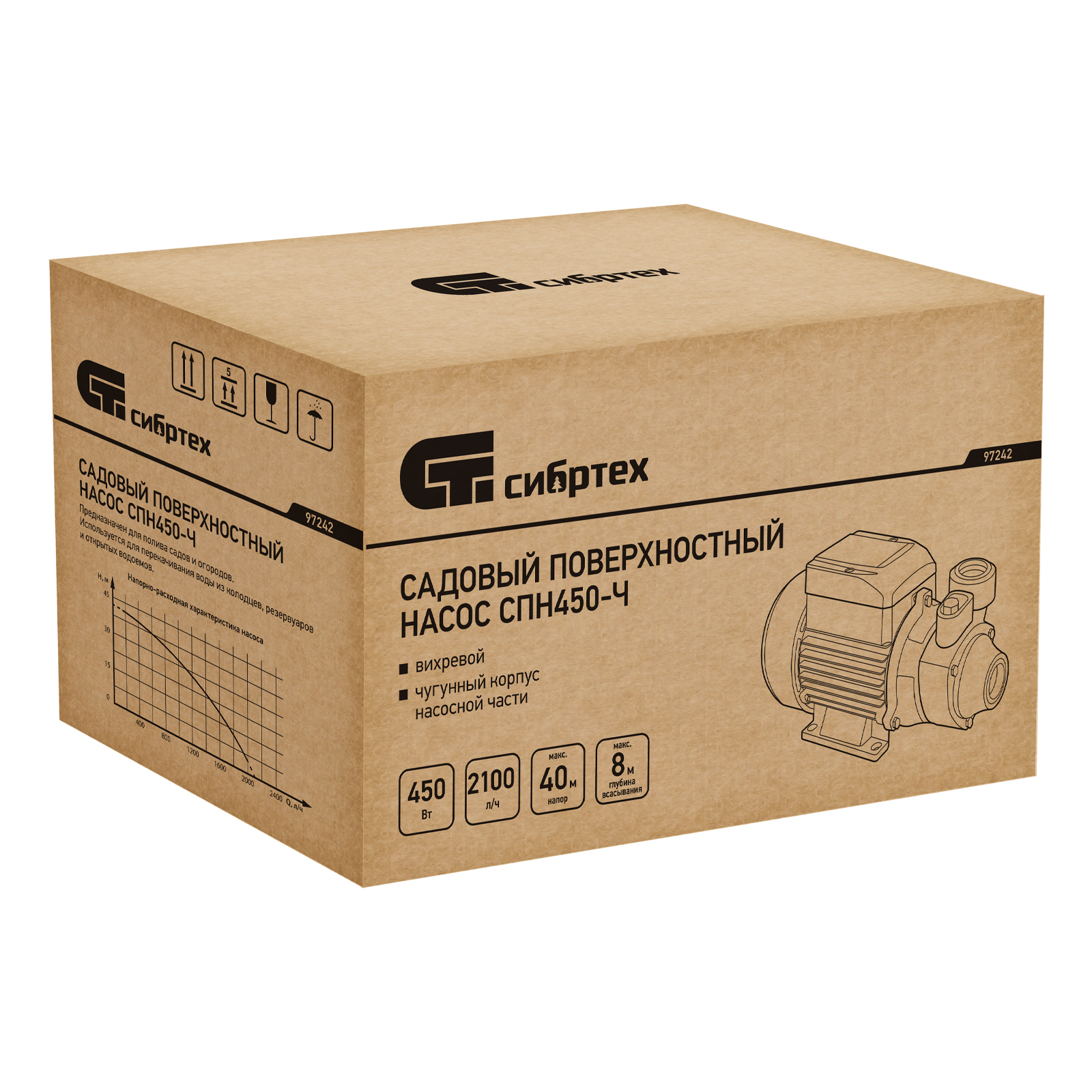 Садовый поверхностный насос СПН450-Ч, 450 Вт, напор 40 м, 2100 л/ч, чугун Сибртех в Воронеже