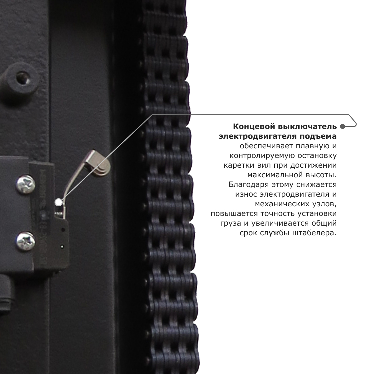 На штабелере установлены кнопка аварийного отключения, позволяющая быстро остановить штабелер в случае возникновения опасной ситуации, и решетчатый экран на мачте, защищающий оператора от возможных травм. Ручка управления имеет интегрированный замок зажигания и полный набор необходимых клавиш управления, в том числе кнопку «черепашьего хода». Функция «черепашьего хода» позволяет ограничивать скорость движения штабелера для лучшего позиционирования.