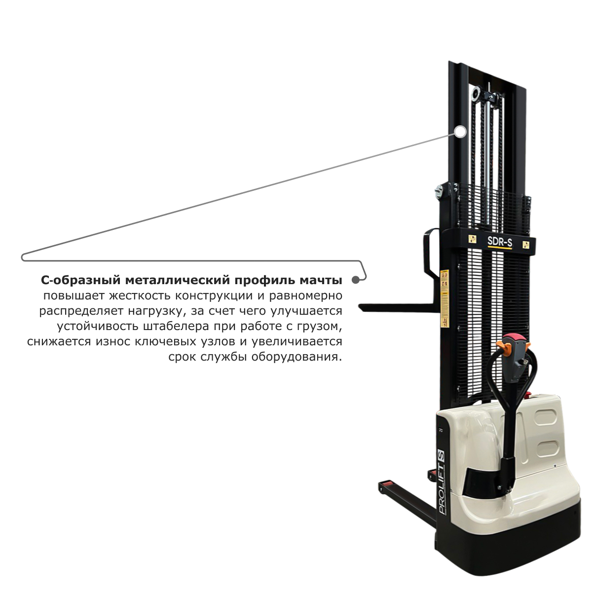 Мачта выполнена из С-образного профиля с дополнительными ребрами жесткости. Благодаря такой конструктивной особенности срок эксплуатации штабелера значительно возрастает.
