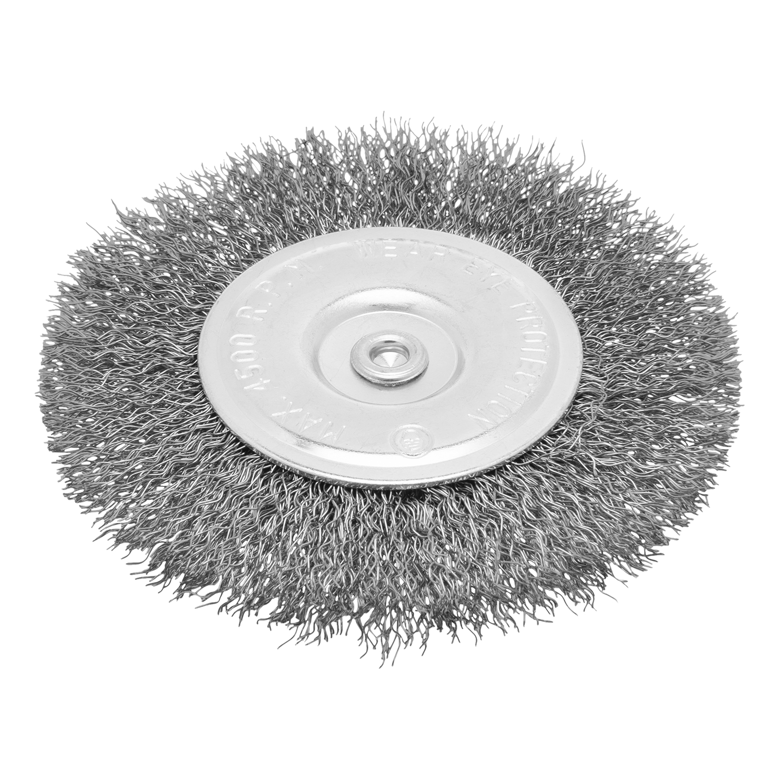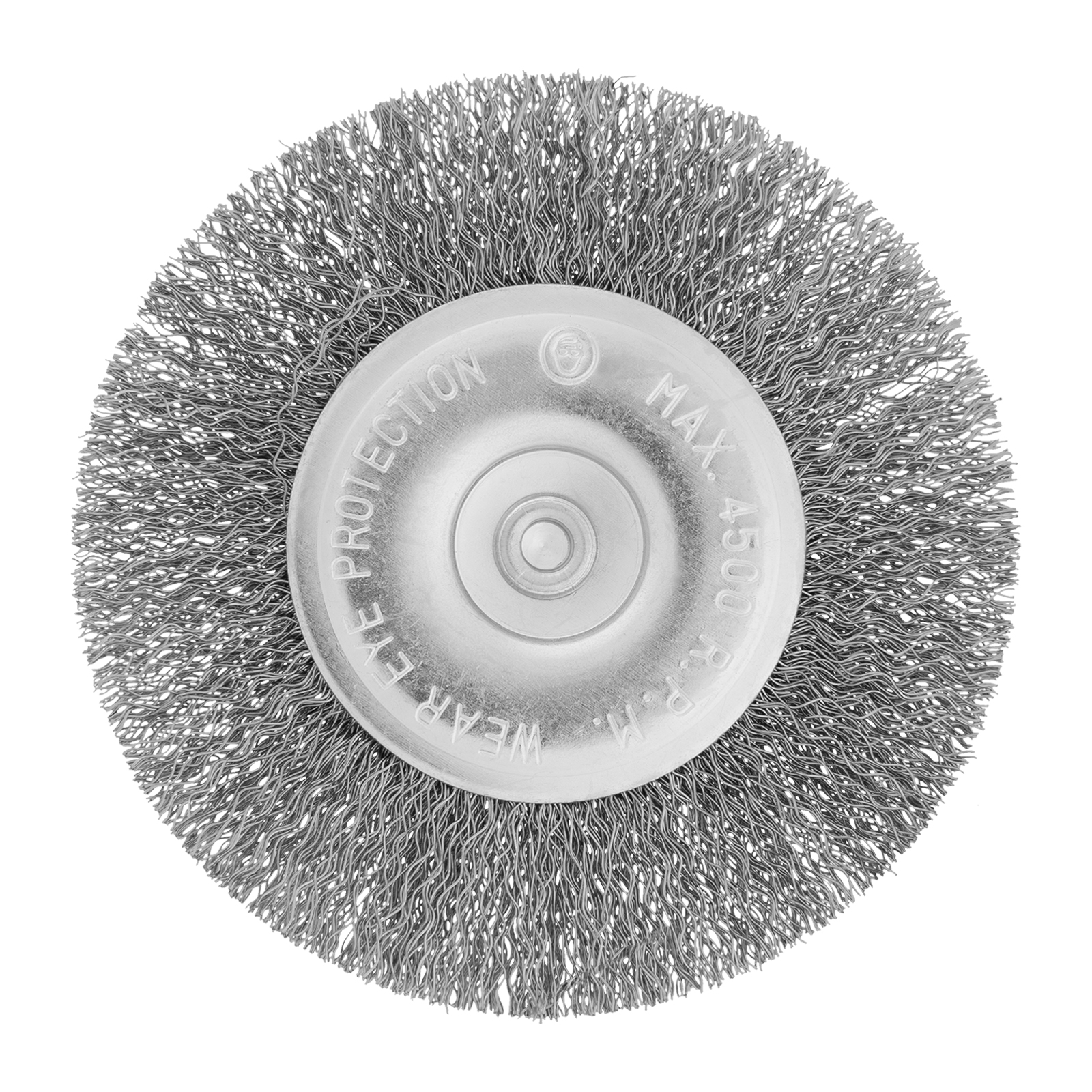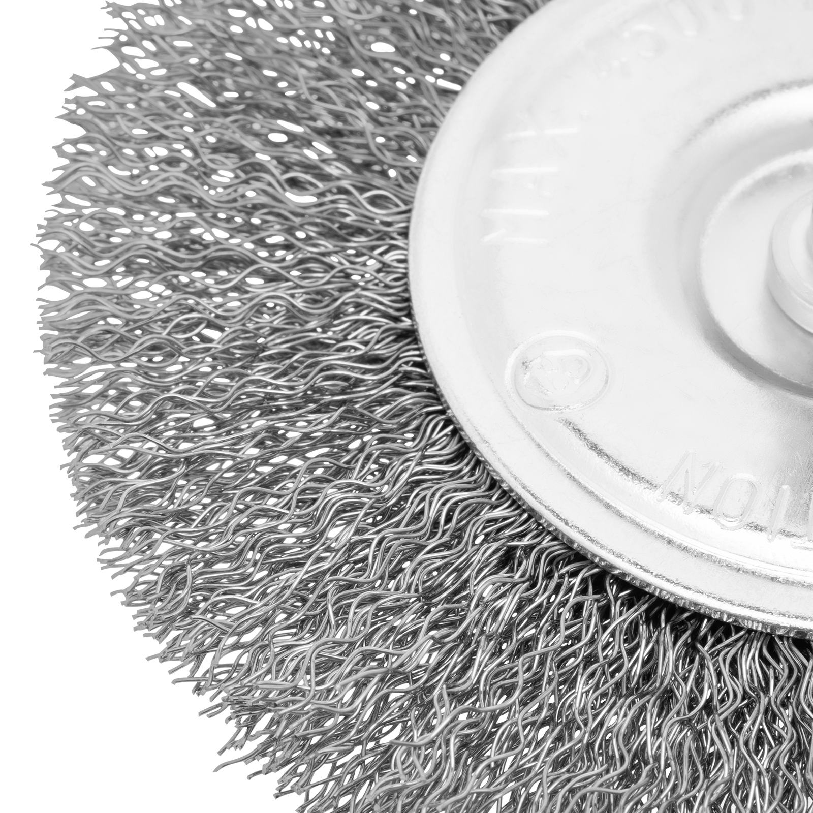 Плоская щетка для дрели Сибртех 744507 диаметром 100 мм, со шпилькой и щетиной из витой проволоки 0,3 мм, используется для щадящей обработки металлических, деревянных и пластиковых поверхностей. Удаляет загрязнения, ржавчину, старые лакокрасочные покрытия. Благодаря плоской форме щетка идеально подходит для очистки труднодоступных мест, пазов, изгибов, внутренних углов. Хвостовик диаметром 6 мм устанавливается в патрон дрели. Рекомендуемая скорость вращения 4500 об/мин. Во время работы следует использовать средства индивидуальной защиты. Щетку применяют во время строительства, ремонта, а также в быту.