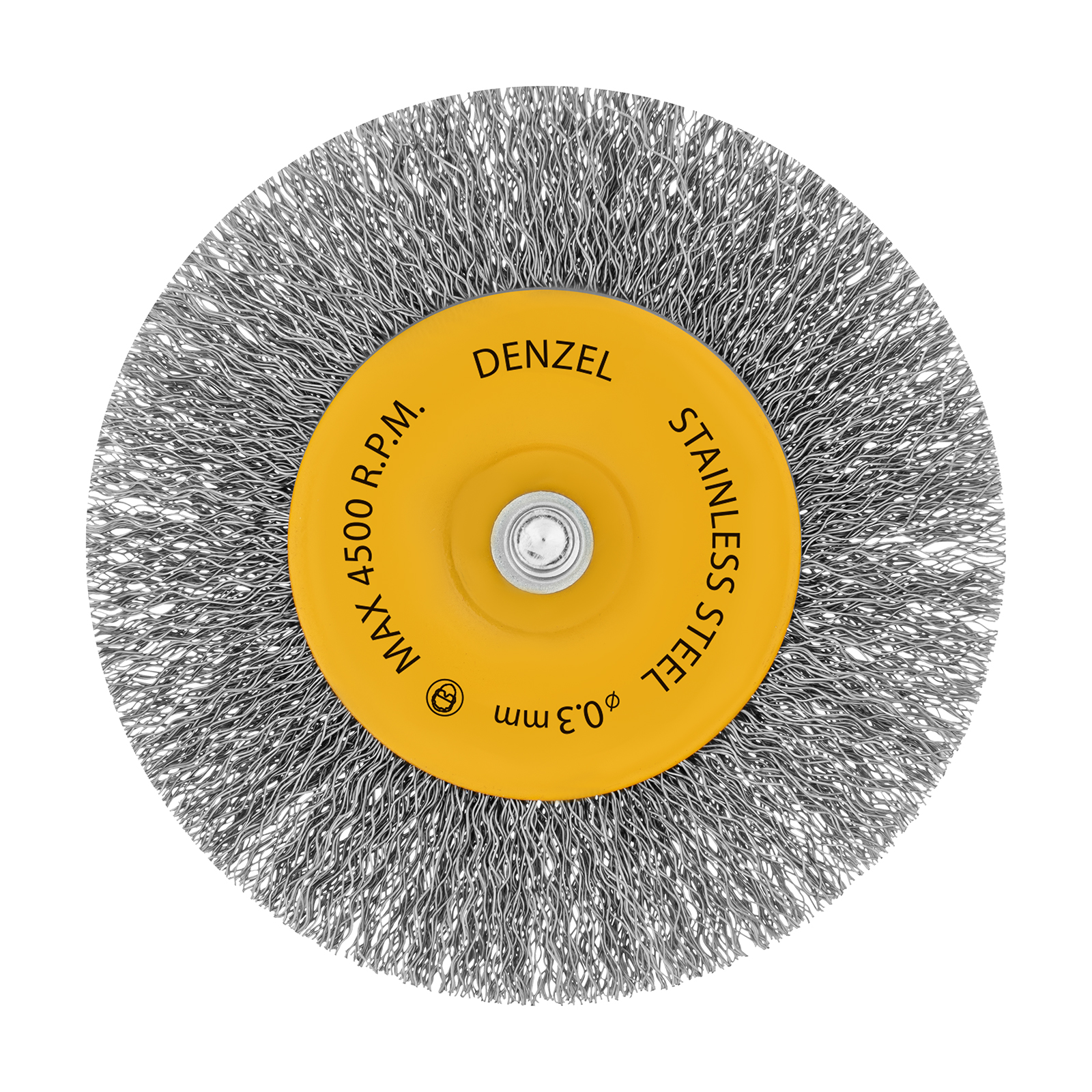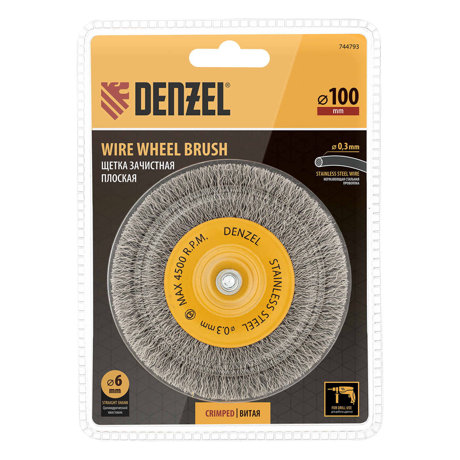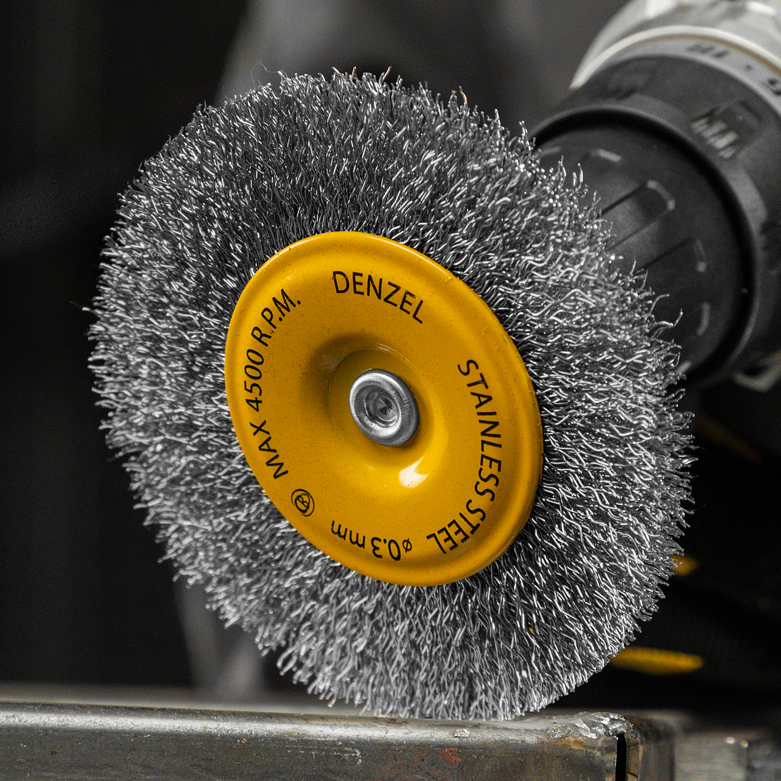Щетка для дрели 100 мм, Плоская, со шпилькой, нержавеющая витая проволока Denzel в Воронеже