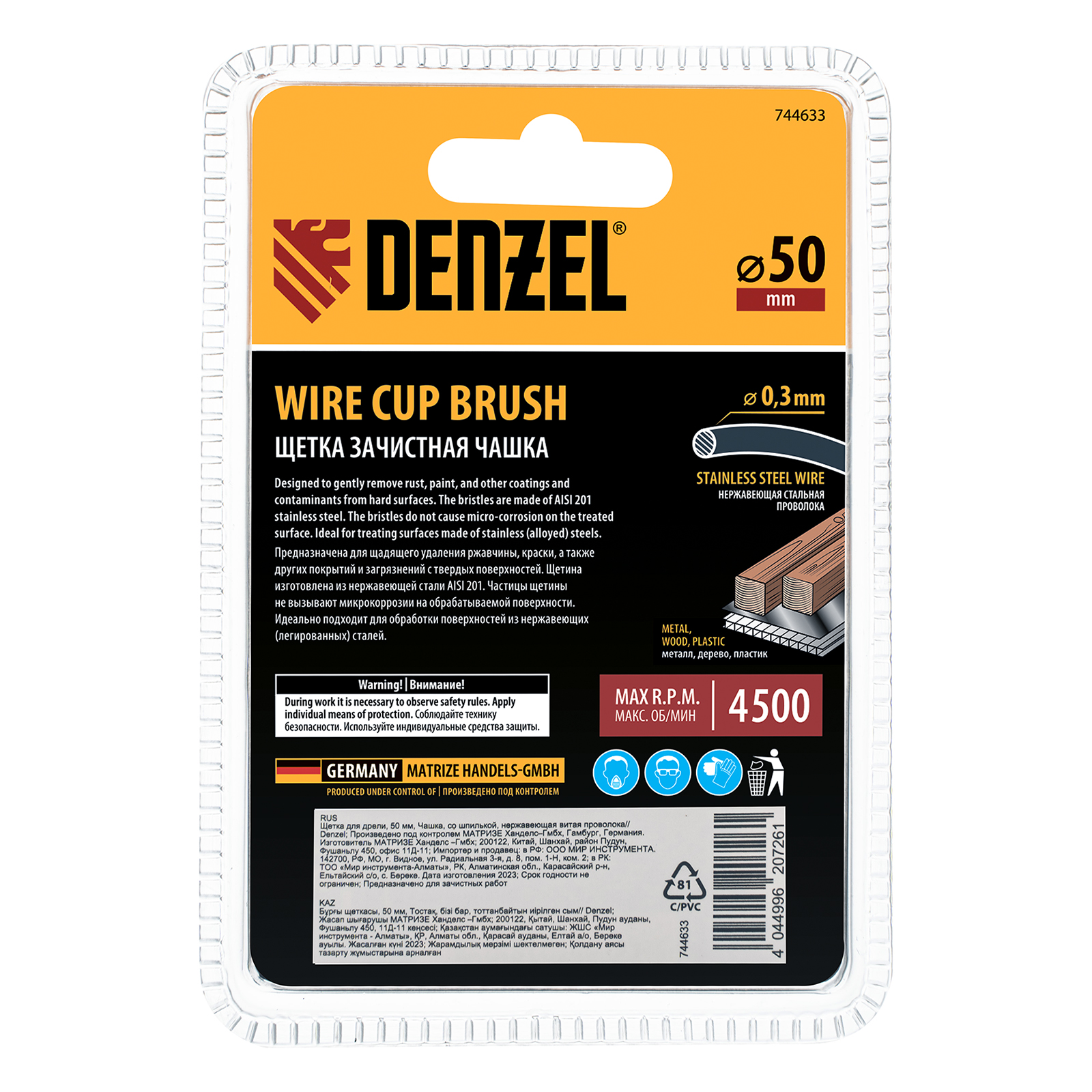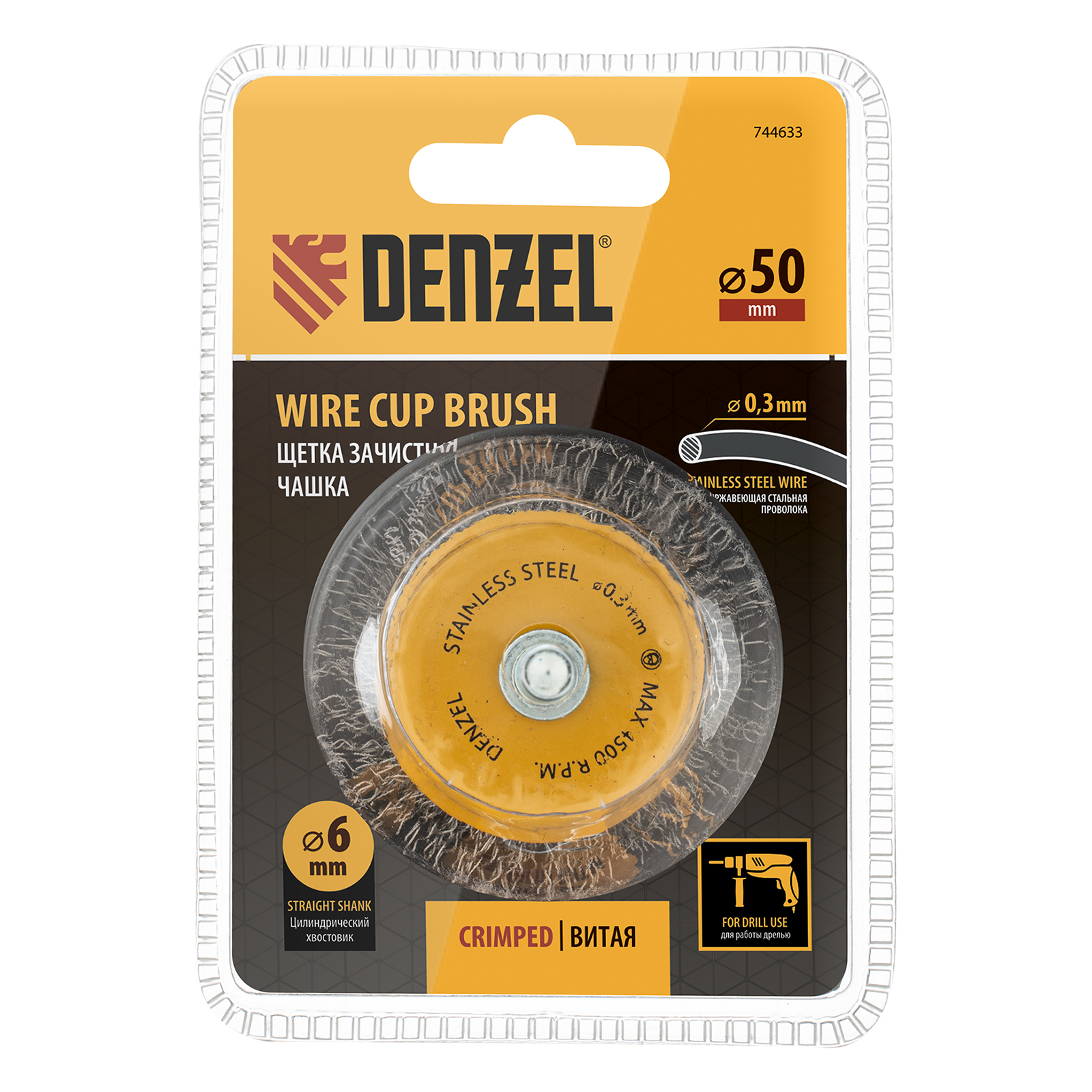 Щетка для дрели, 50 мм, Чашка, со шпилькой, нержавеющая витая проволока Denzel в Воронеже