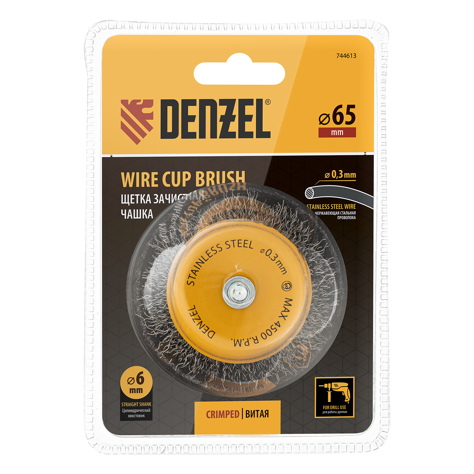 Щетка для дрели «Чашка» Denzel 744613 диаметром 65 мм, со шпилькой и щетиной из нержавеющей витой проволоки, используется для щадящей обработки плоских твердых поверхностей из металла, древесины, пластика, идеально подходит для нержавеющей стали. Оптимальна для снятия тонкого слоя старой краски, ржавчины, удаления загрязнений. Имеет хвостовик диаметром 6 мм и устанавливается в патрон дрели или прямошлифовальной машины (ПШМ).