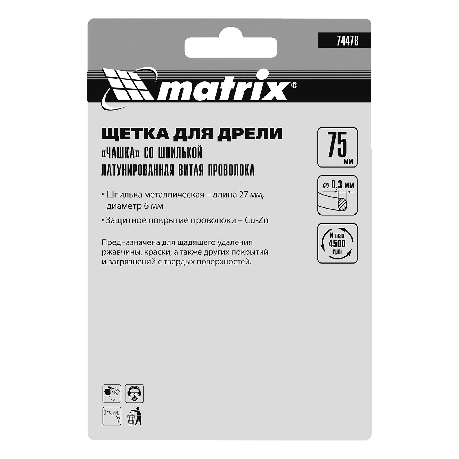 Щетка для дрели «чашка» Matrix 74478 диаметром 75 мм, со шпилькой и щетиной из латунированной витой проволоки, используется для очистки металлических, деревянных и пластиковых поверхностей от незначительных загрязнений и остатков лакокрасочных покрытий. Помогает подчеркнуть структуру материала или придать ему шероховатость. Хвостовик диаметром 6 мм устанавливается в патрон электродрели, поддерживающей скорость 4500 об/мин. Во время работы нужно использовать средства индивидуальной защиты — респиратор, очки, наушники, спецодежду и обувь. Щетка пригодится как профессиональным, так и домашним мастерам.