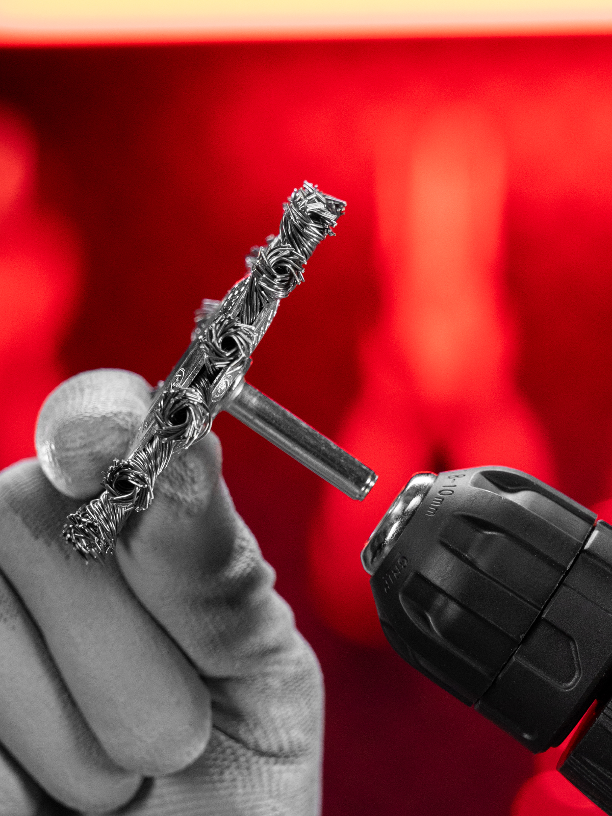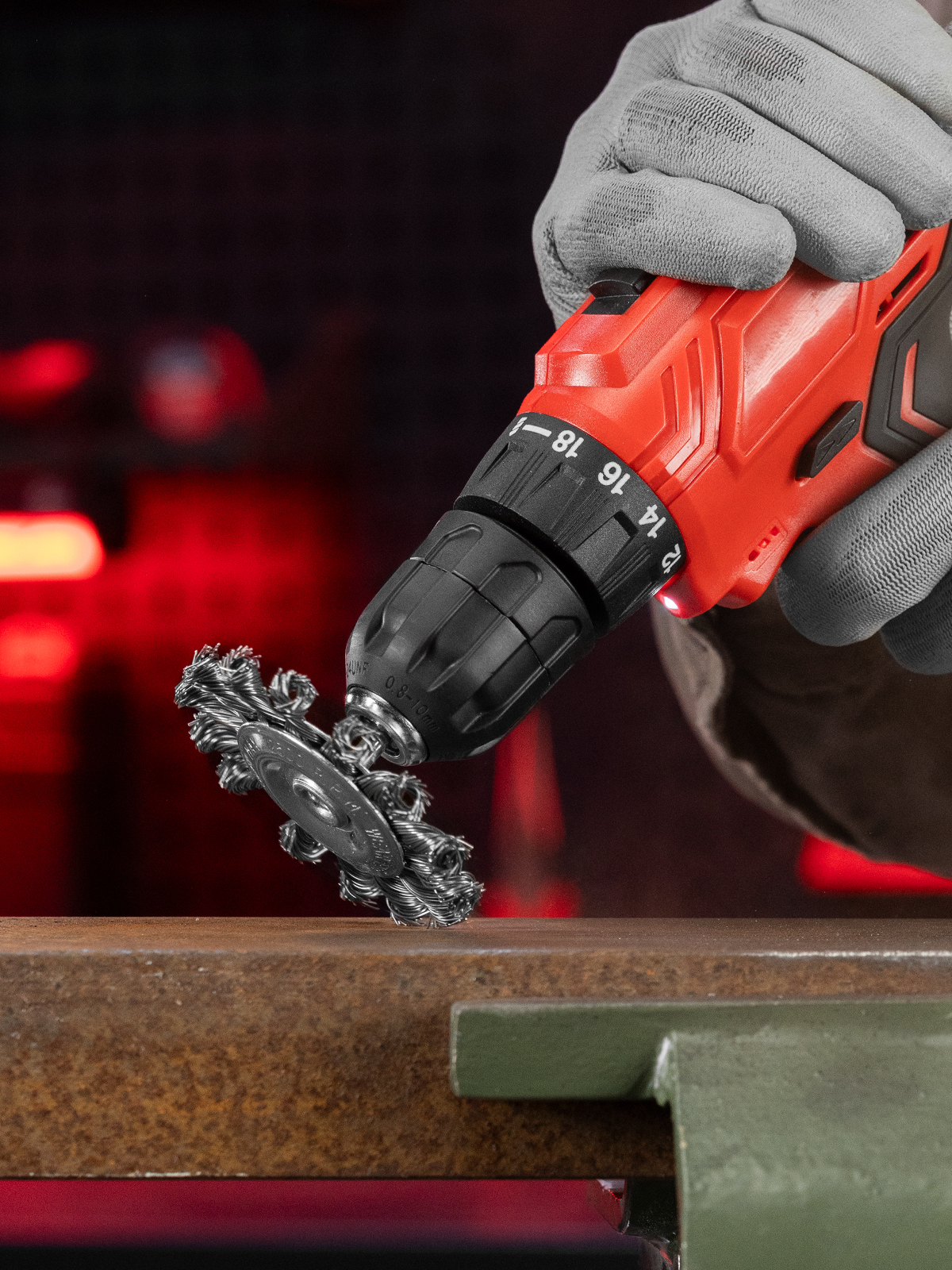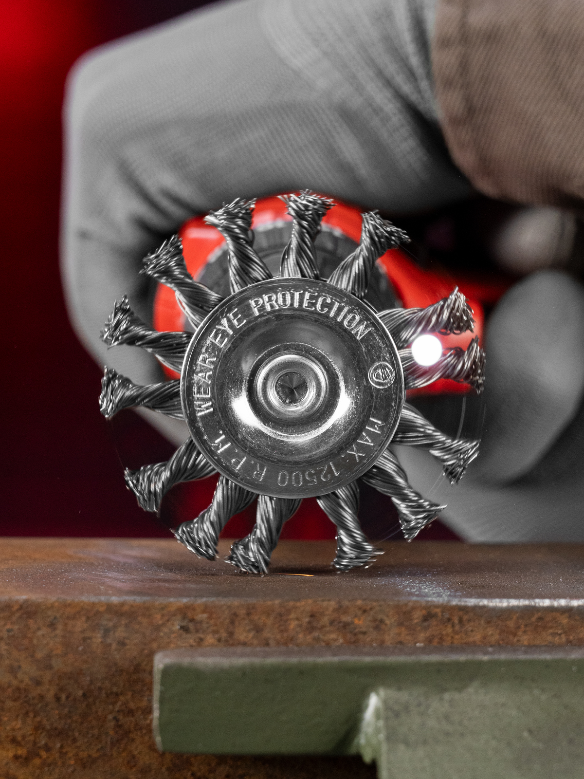 - Эффективность и износостойкость — щетина из крученой стальной проволоки диаметром 0,5 мм успешно справляется с толстым слоем ржавчины или лакокрасочного покрытия.