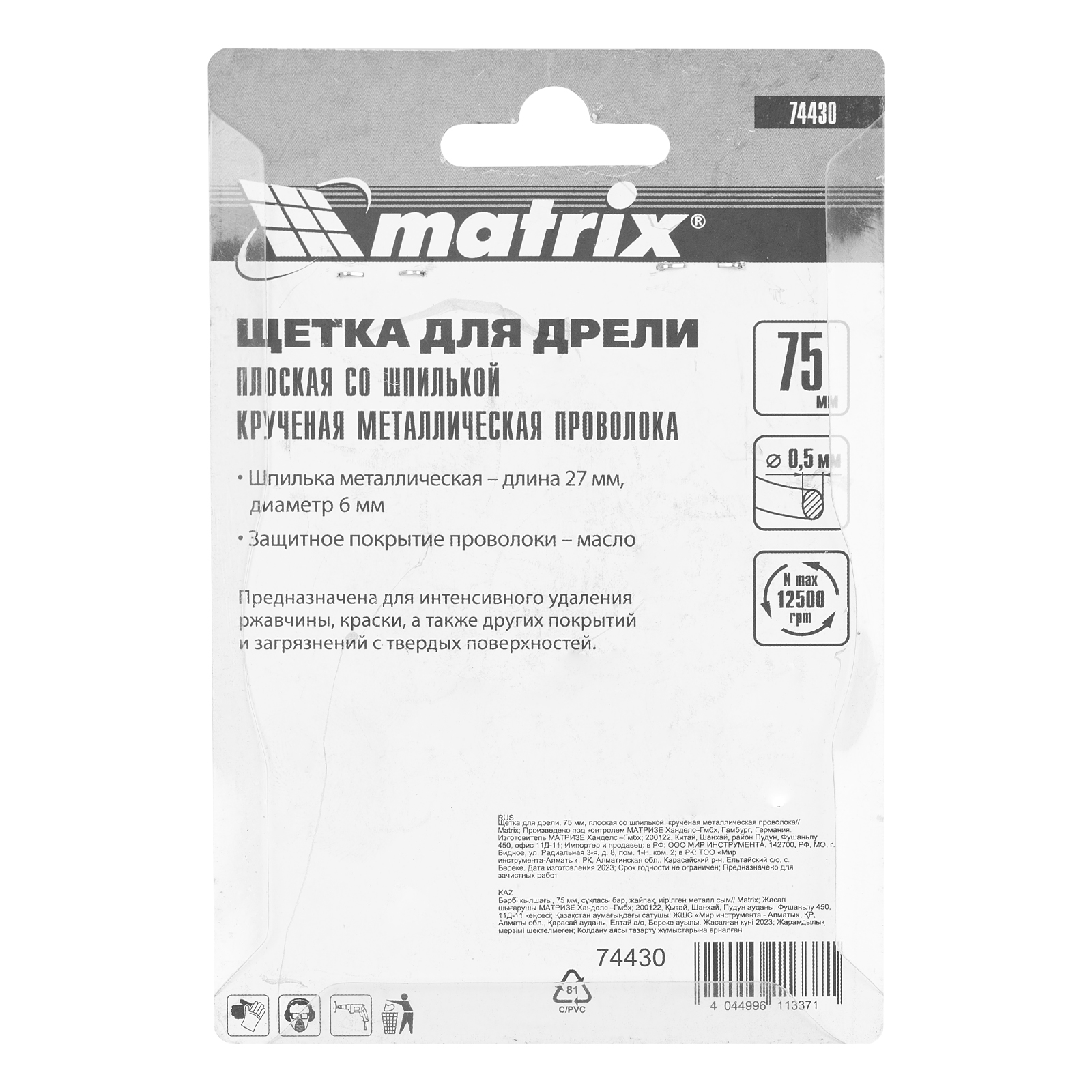 Плоская щетка со шпилькой для дрели Matrix 74430 диаметром 75 мм, с щетиной из крученой металлической проволоки, позволяет быстро очистить металлическую, деревянную или бетонную поверхность от загрязнений, ржавчины, старой краски или лака. Используется для обработки внутренних углов, пазов, изгибов, узких и труднодоступных мест. Подходит для очистки сварных швов. При помощи хвостовика диаметром 6 мм щетку устанавливают в патрон дрели или ПШМ с максимальной частотой вращения до 12500 об/мин. Насадка применяется в строительстве, машиностроении, пригодится также в быту. Во время работы со щеткой следует использовать средства индивидуальной защиты.