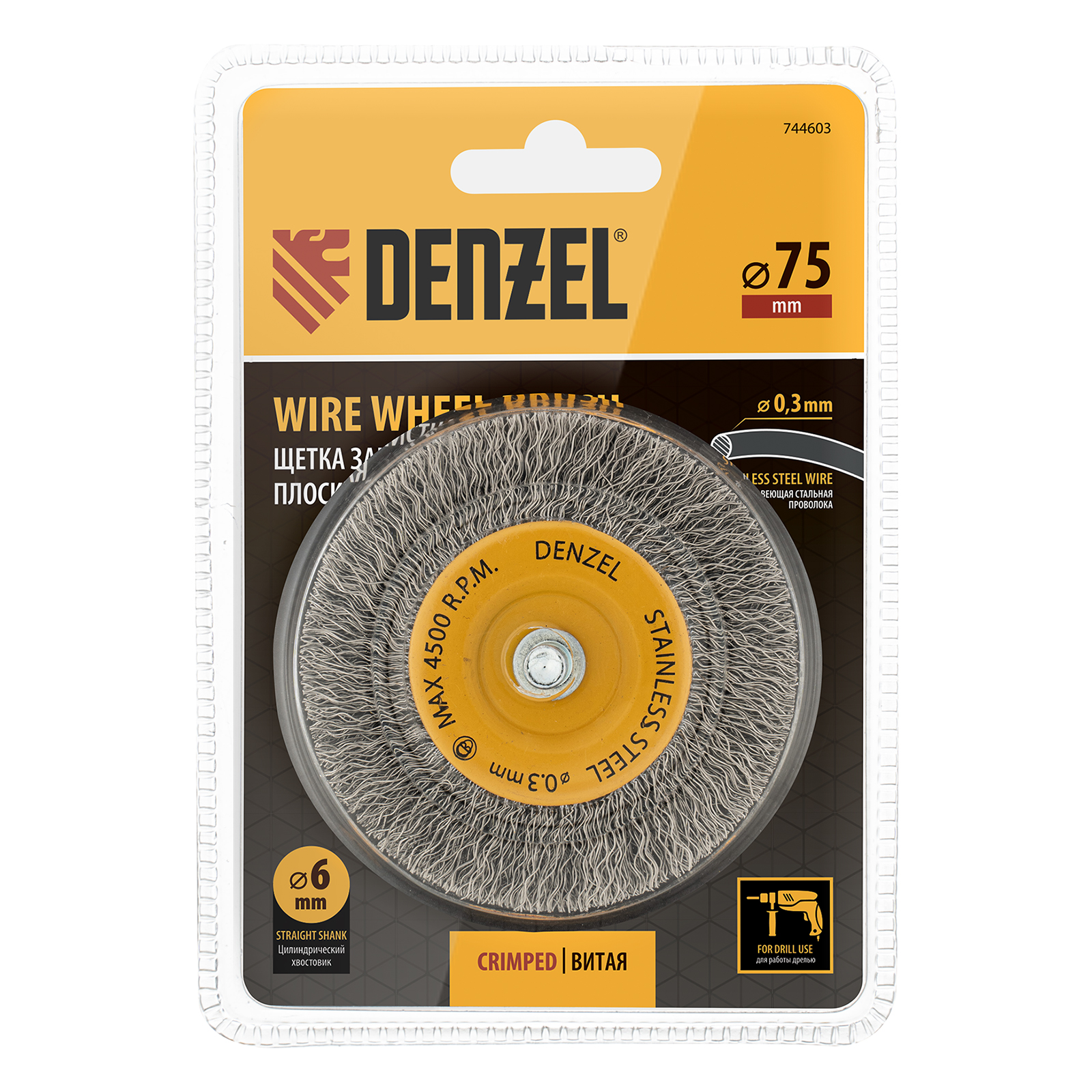 Щетка для дрели, 75 мм, Плоская, со шпилькой, нержавеющая витая проволока Denzel в Воронеже