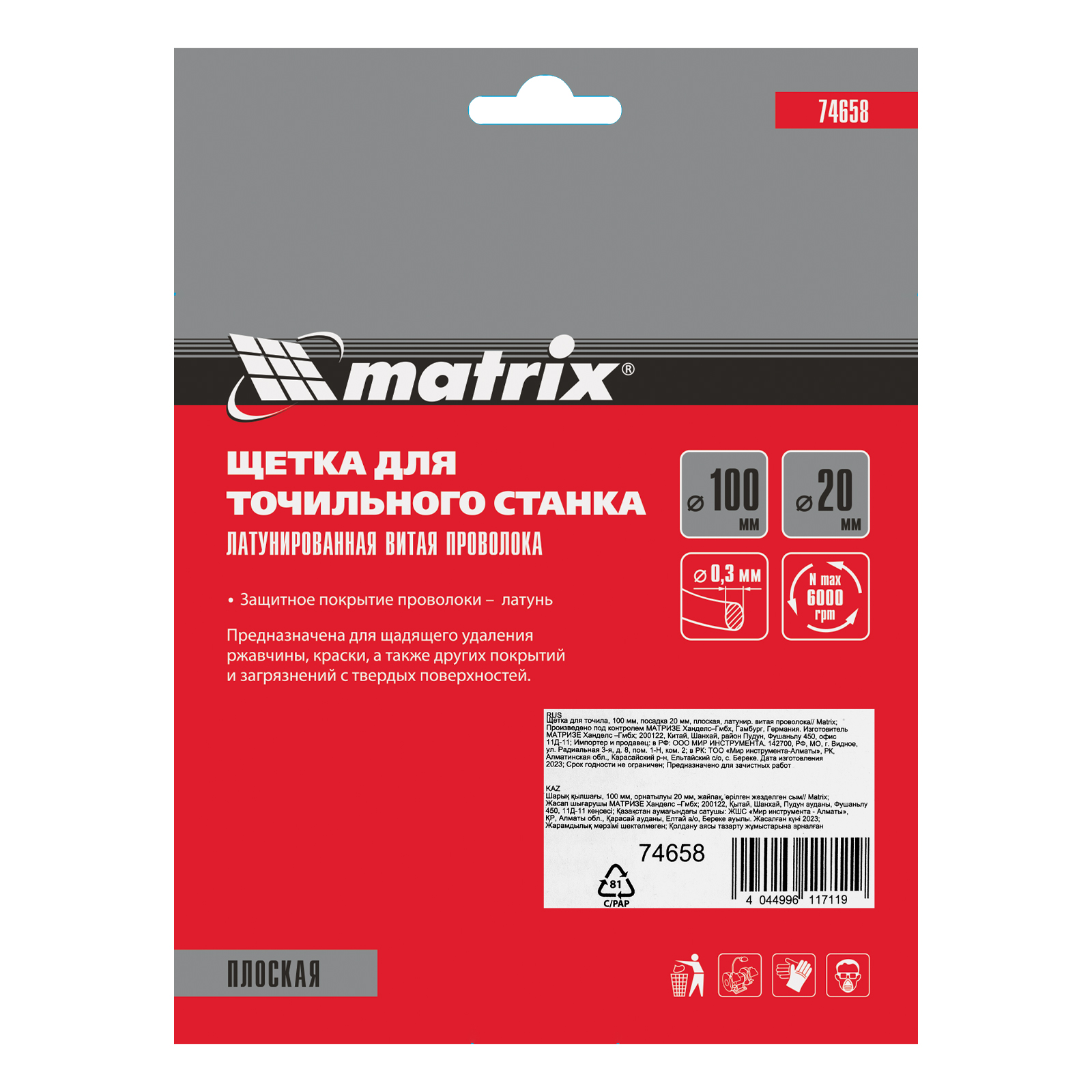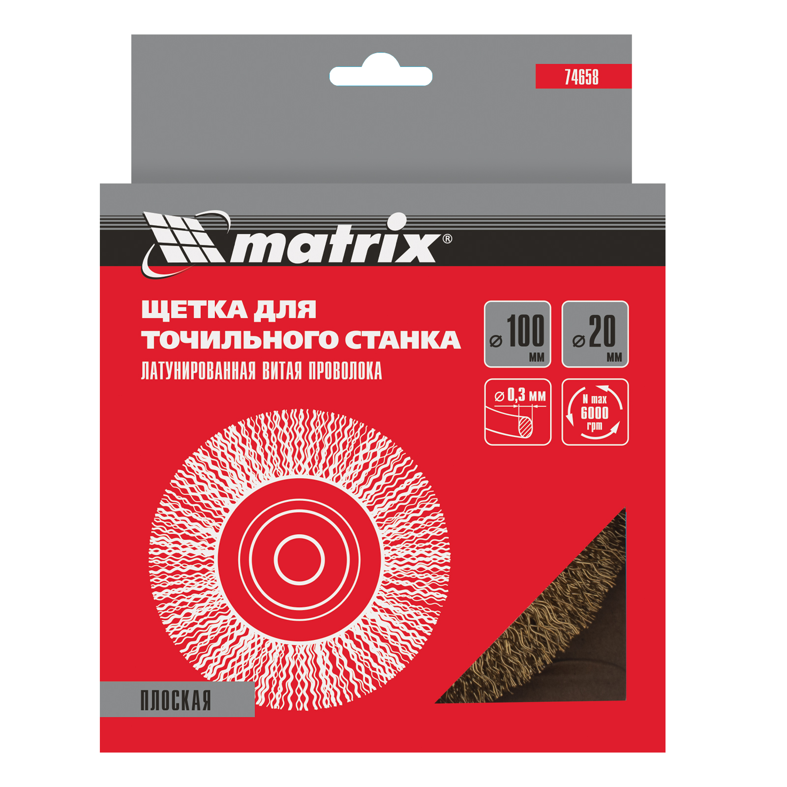 Плоская щетка Matrix 74658 диаметром 100 мм, с щетиной из латунированной витой проволоки, устанавливается на точило с посадочным размером 20 мм. Рекомендуемая скорость вращения — не более 6000 об/мин. Витая проволока позволяет в щадящем режиме зачистить тонкий слой ржавчины и лакокрасочных покрытий, удалить различные загрязнения с небольших или хрупких деталей. Благодаря плоской форме щетка подходит для обработки труднодоступных мест.