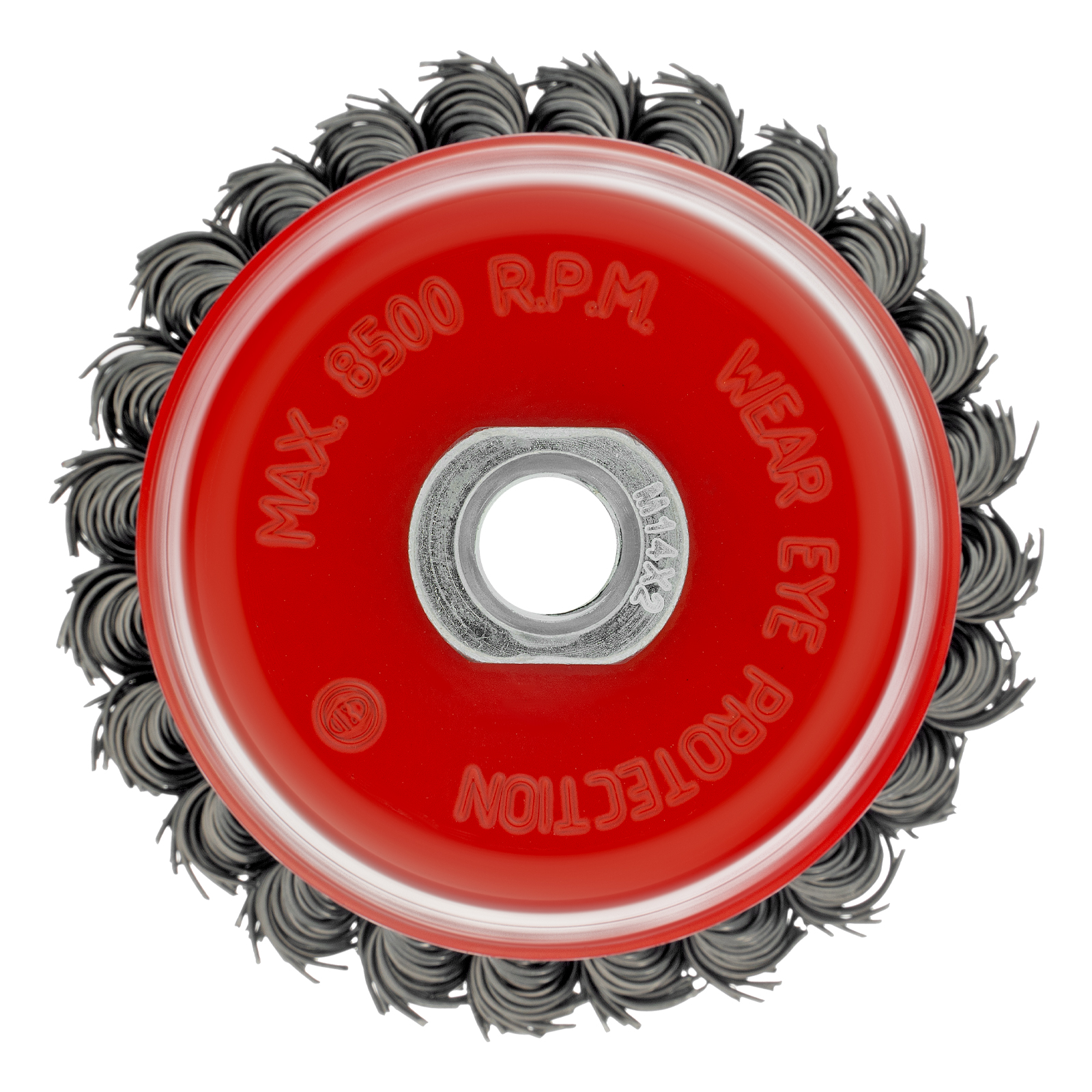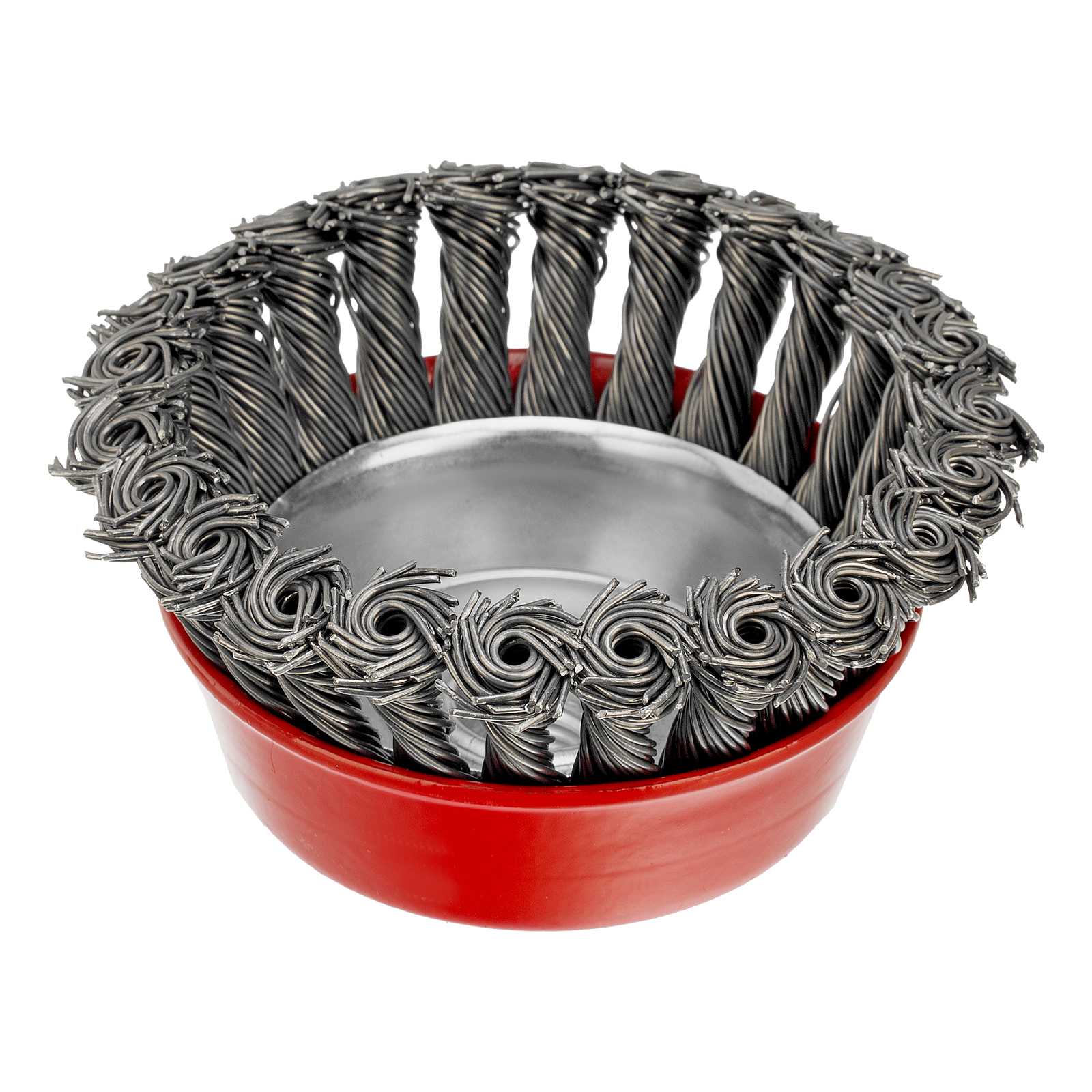 Щетка Matrix «Чашка» 74623 диаметром 100 мм, с присоединительной резьбой М14, с щетиной из крученой проволоки диаметром 0,8 мм, устанавливается на УШМ, поддерживающую работу со скоростью 8500 об/мин. Щетина предназначена для грубой (черновой) обработки поверхностей, более агрессивной по сравнению с щетиной 0,5 мм. Изделие подходит для удаления загрязнений, снятия толстого слоя ржавчины, ЛКМ, зачистки сварных швов.