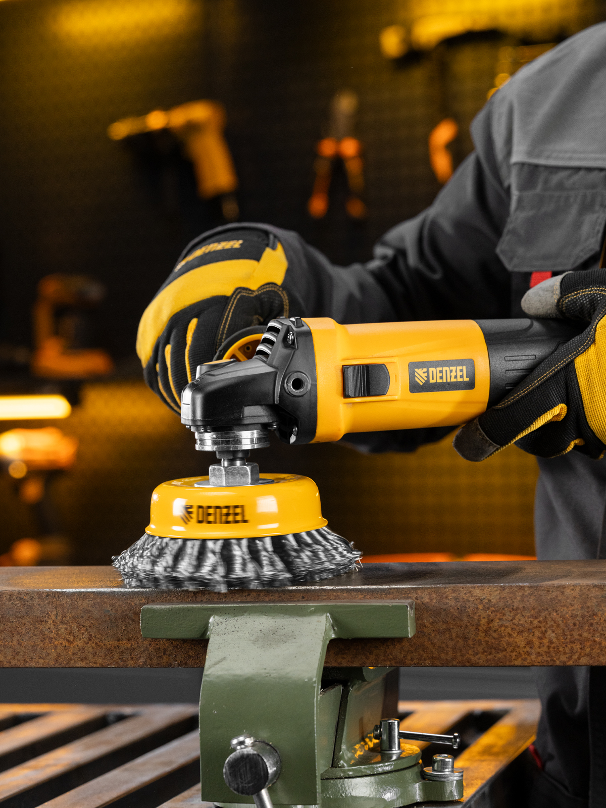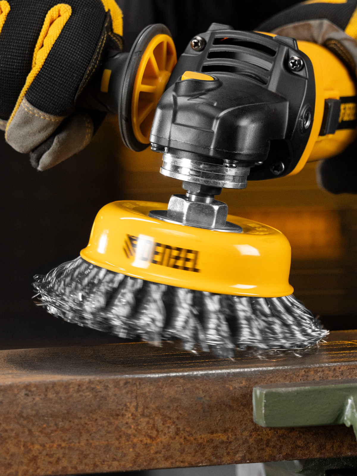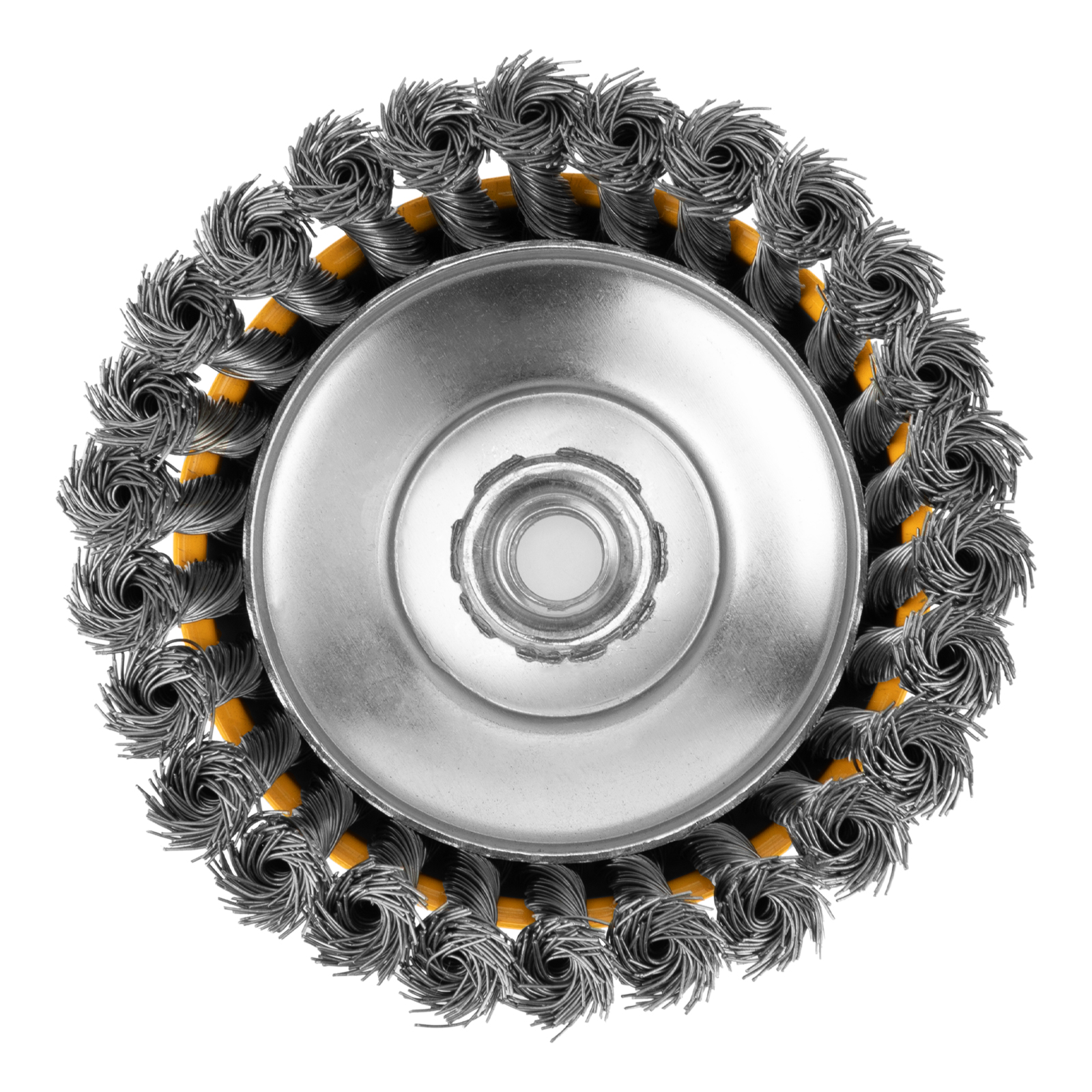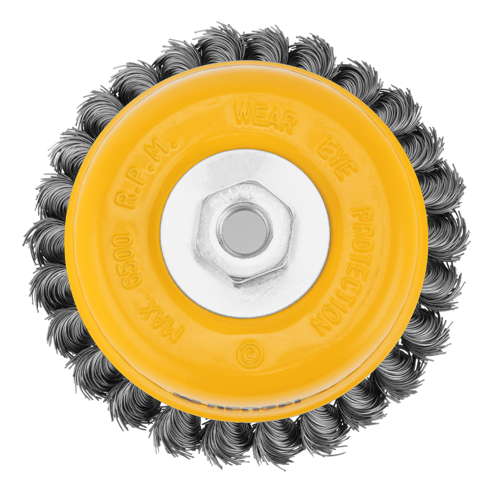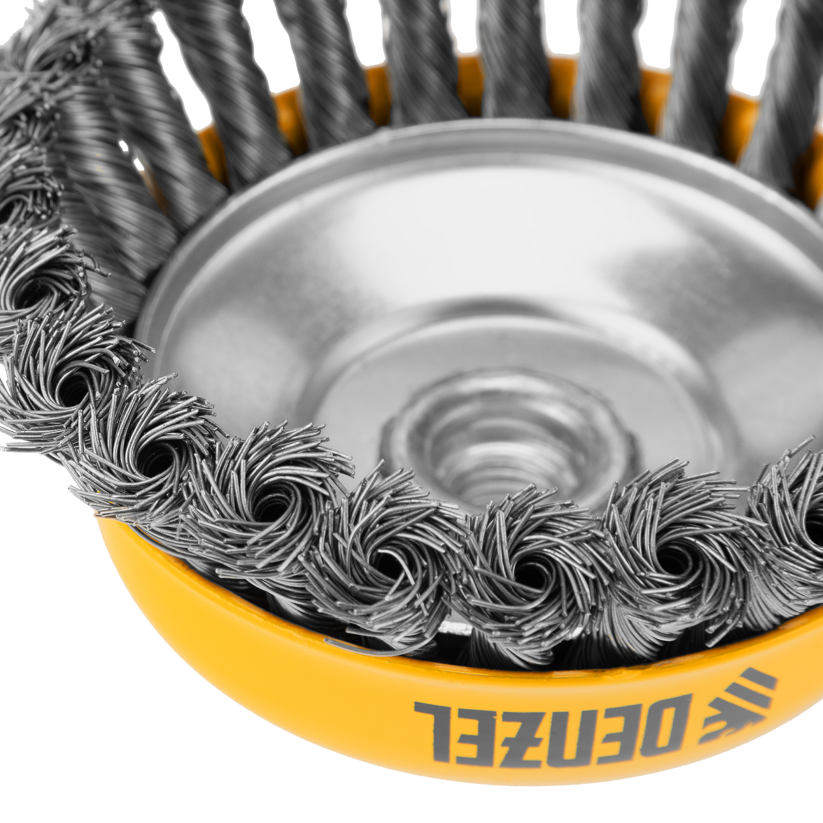 Щетка для УШМ «Чашка» Denzel 746273, М14, диаметром 125 мм, с щетиной из крученой нержавеющей проволоки диаметром 0,5 мм, предназначена для грубой очистки твердых поверхностей от ржавчины, лакокрасочных покрытий, загрязнений, удаления заусенцев, а также для зачистки сварных швов. Снимает толстый слой материала, идеально подходит для обработки изделий из нержавеющей стали. Щетка имеет форму чашки и позволяет очищать участки большой площади. Оснастку устанавливают на вал углошлифовальной машины. Рекомендуемая максимальная скорость вращения составляет 6500 об/мин. Во время работы следует использовать средства индивидуальной защиты — очки, респиратор, наушники, перчатки, а также специальную одежду и обувь. Щетка применяется в строительстве, на производстве, а также в быту.