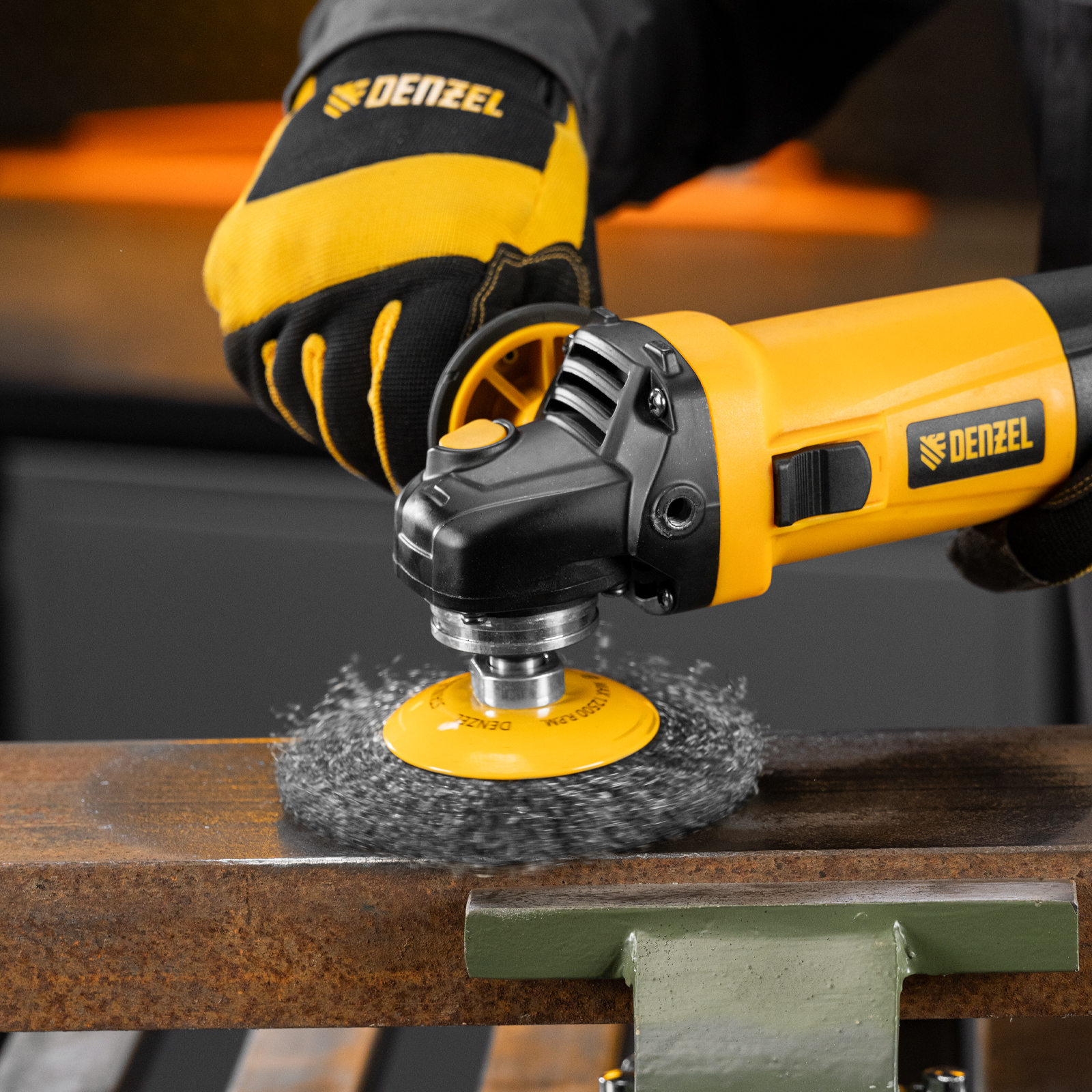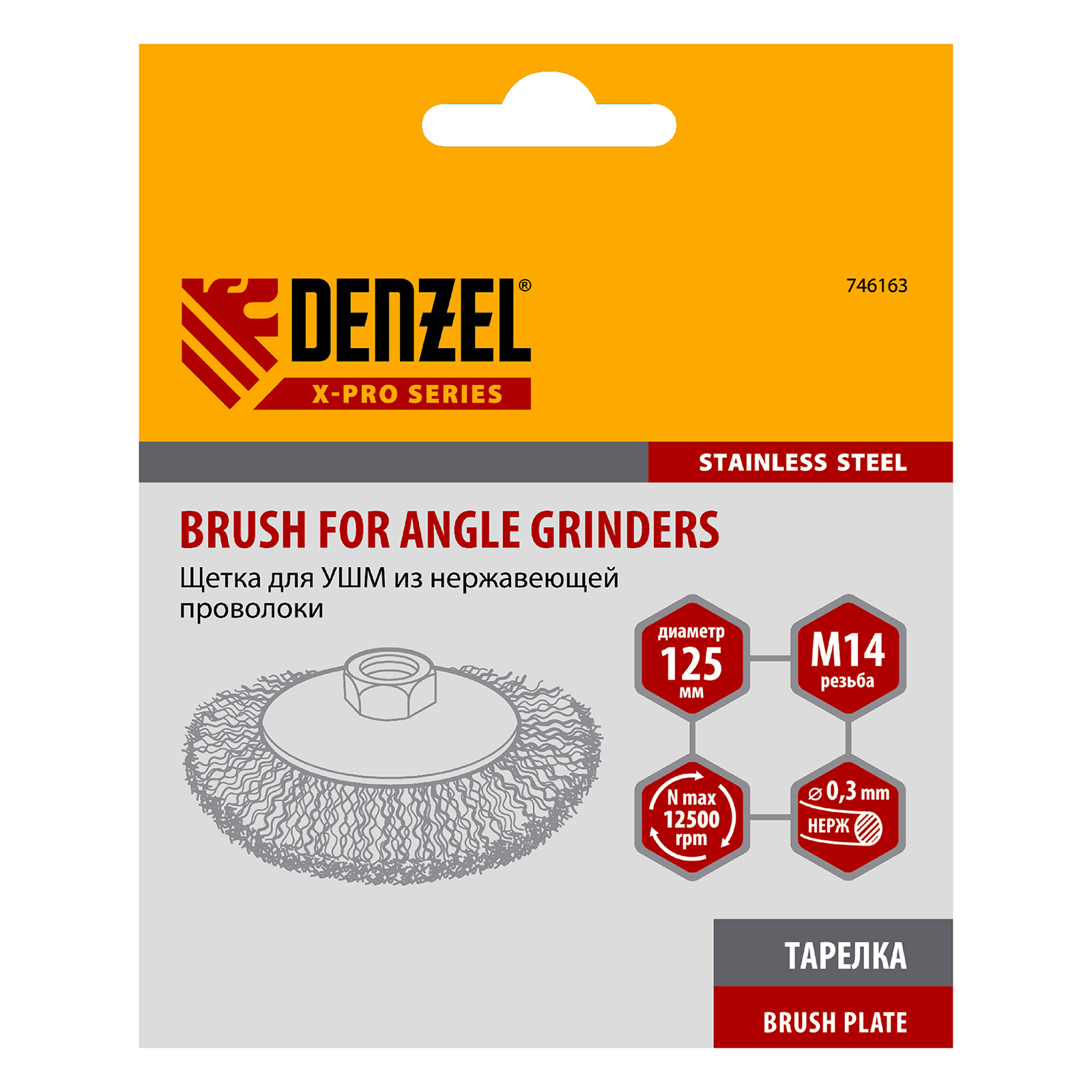 Щетка для УШМ «Тарелка» Denzel 746163, М14, диаметром 125 мм, с щетиной из витой нержавеющей проволоки 0,3 мм, используется для щадящей обработки металлических, в том числе нержавеющих, а также деревянных и пластиковых поверхностей. Постепенно снимает тонкий слой ржавчины, старого лака или краски, удаляет загрязнения. Подходит для придания поверхности заданной шероховатости или подчеркивания структуры дерева. Тарельчатая форма щетки оптимальна для обработки как плоскостей, так и труднодоступных мест. Щетку устанавливают на вал углошлифовальной машины (УШМ), поддерживающей работу со скоростью до 12500 об/мин. Обязательно использование защитных очков, респиратора, перчаток, наушников, спецодежды и обуви. Щетка предназначена для выполнения профессиональных и бытовых работ.