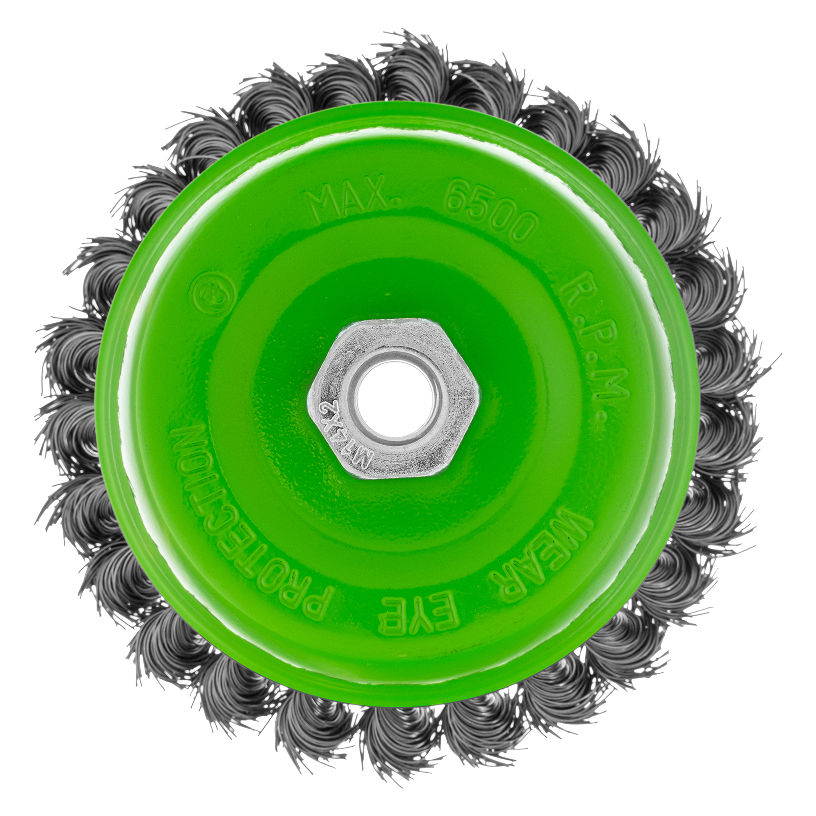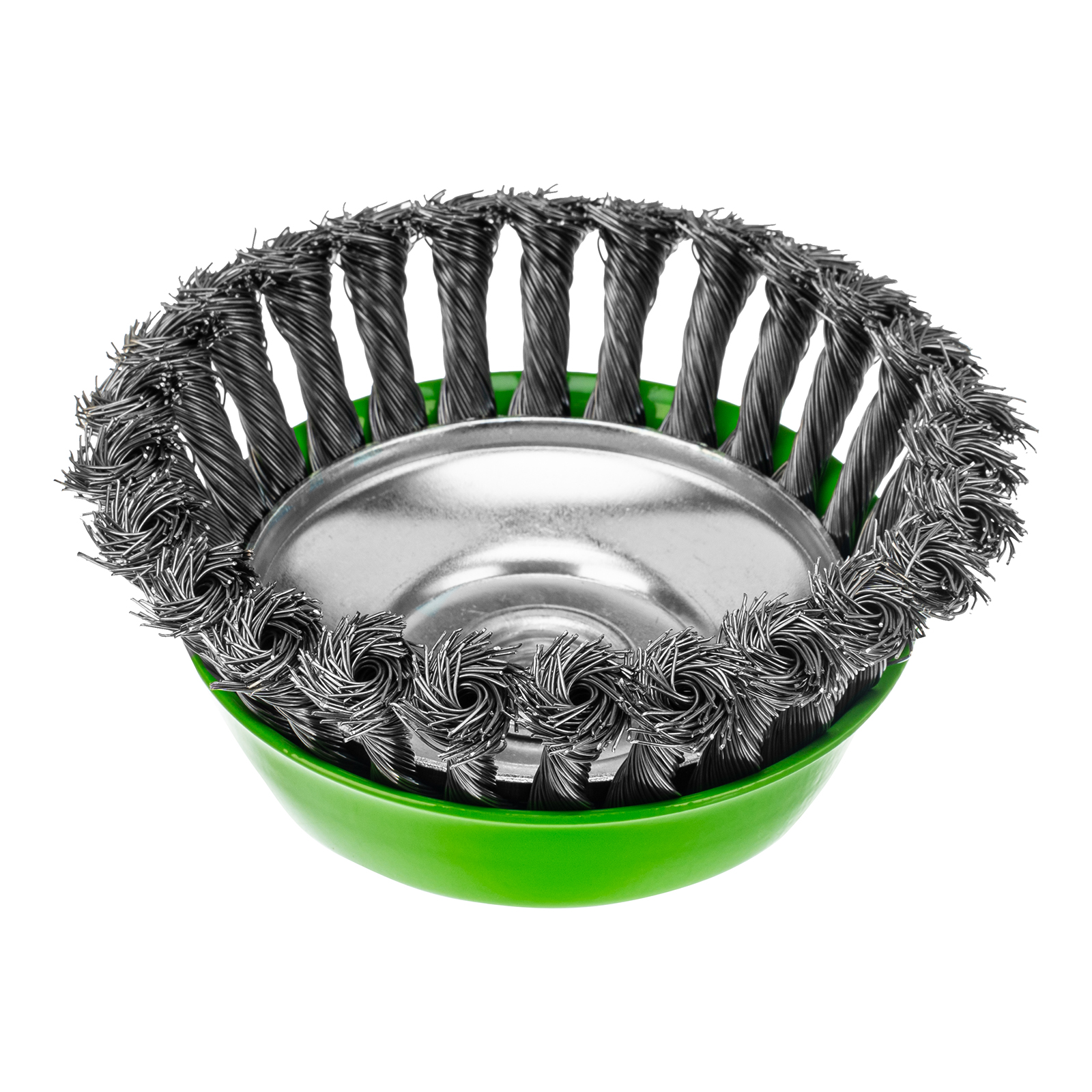 Щетка Сибртех «Чашка» 746277 диаметром 125 мм, с присоединительной резьбой М14, с щетиной из крученой проволоки диаметром 0,5 мм, устанавливается на УШМ, поддерживающую работу со скоростью 6500 об/мин. Изделие предназначено для грубой (черновой) обработки поверхностей и подходит для удаления загрязнений, снятия толстого слоя ржавчины, ЛКМ, зачистки сварных швов.
