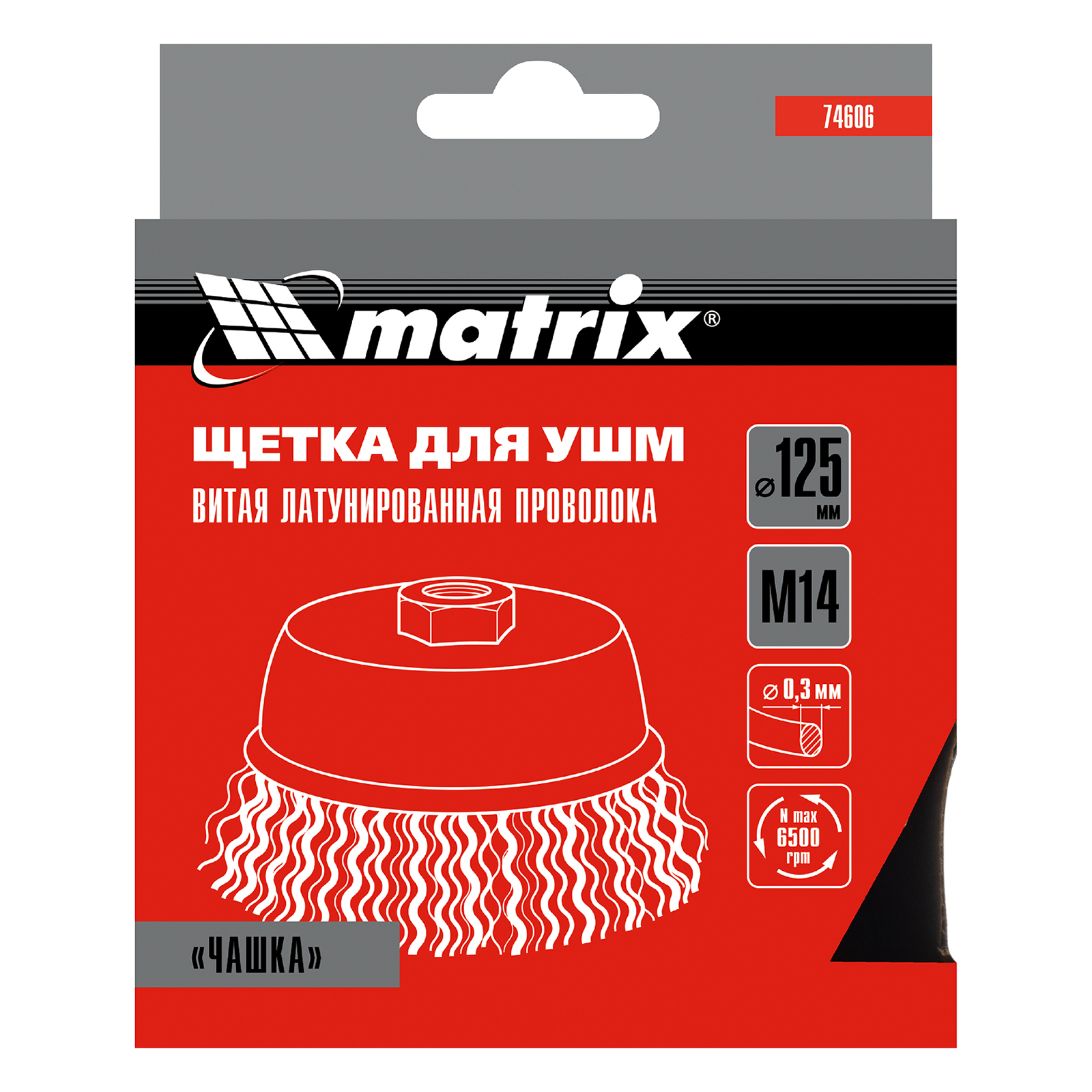 Щетка «чашка» Matrix 74606 диаметром 125 мм, с щетиной из латунированной витой проволоки, устанавливается на вал УШМ с помощью гайки М14. Предназначена для снятия тонкого слоя краски или лака, удаления ржавчины и загрязнений. При рекомендованной скорости вращения 6500 об/мин щеткой можно быстро обрабатывать участки большой площади.