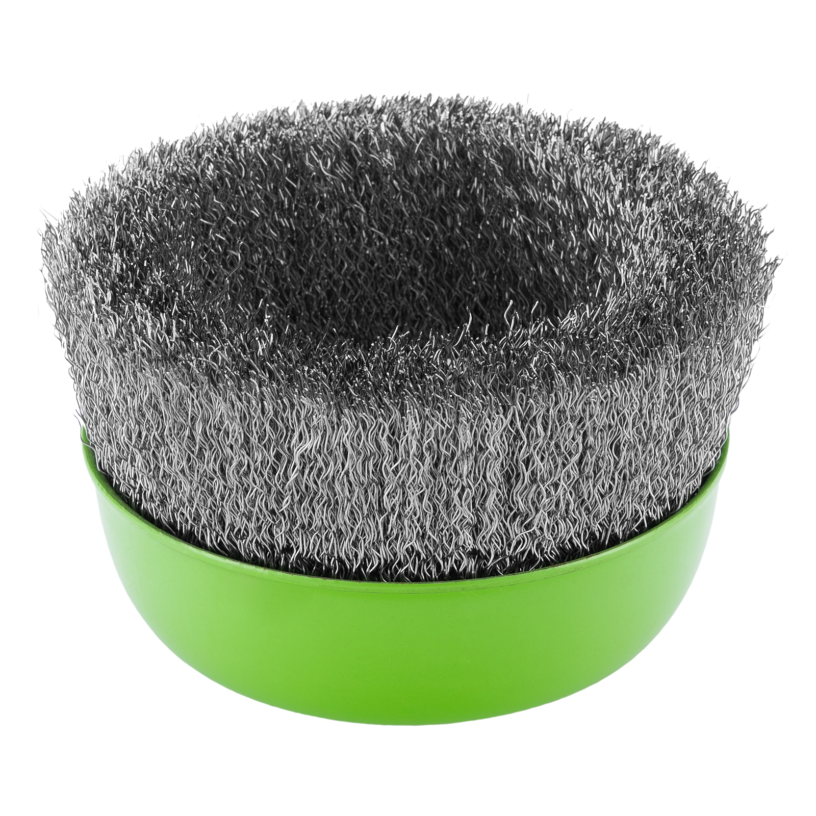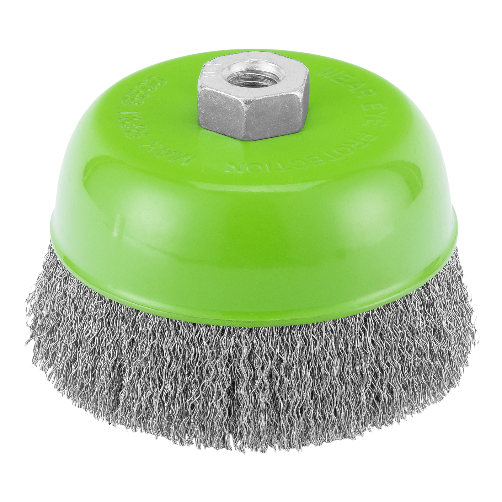 Щетка для УШМ Сибртех «чашка» 746067, М14, диаметром 125 мм, с щетиной из витой проволоки 0,3 мм, предназначена для постепенного снятия тонкого слоя материала с металлических, деревянных и пластиковых поверхностей. Удаляет ржавчину, загрязнения, а также остатки краски и других покрытий. Подходит для обработки участков значительной площади. Щетку устанавливают на вал углошлифовальной машины (УШМ), рекомендуемая максимальная скорость вращения 6500 об/мин. Работать с оснасткой следует в спецодежде.