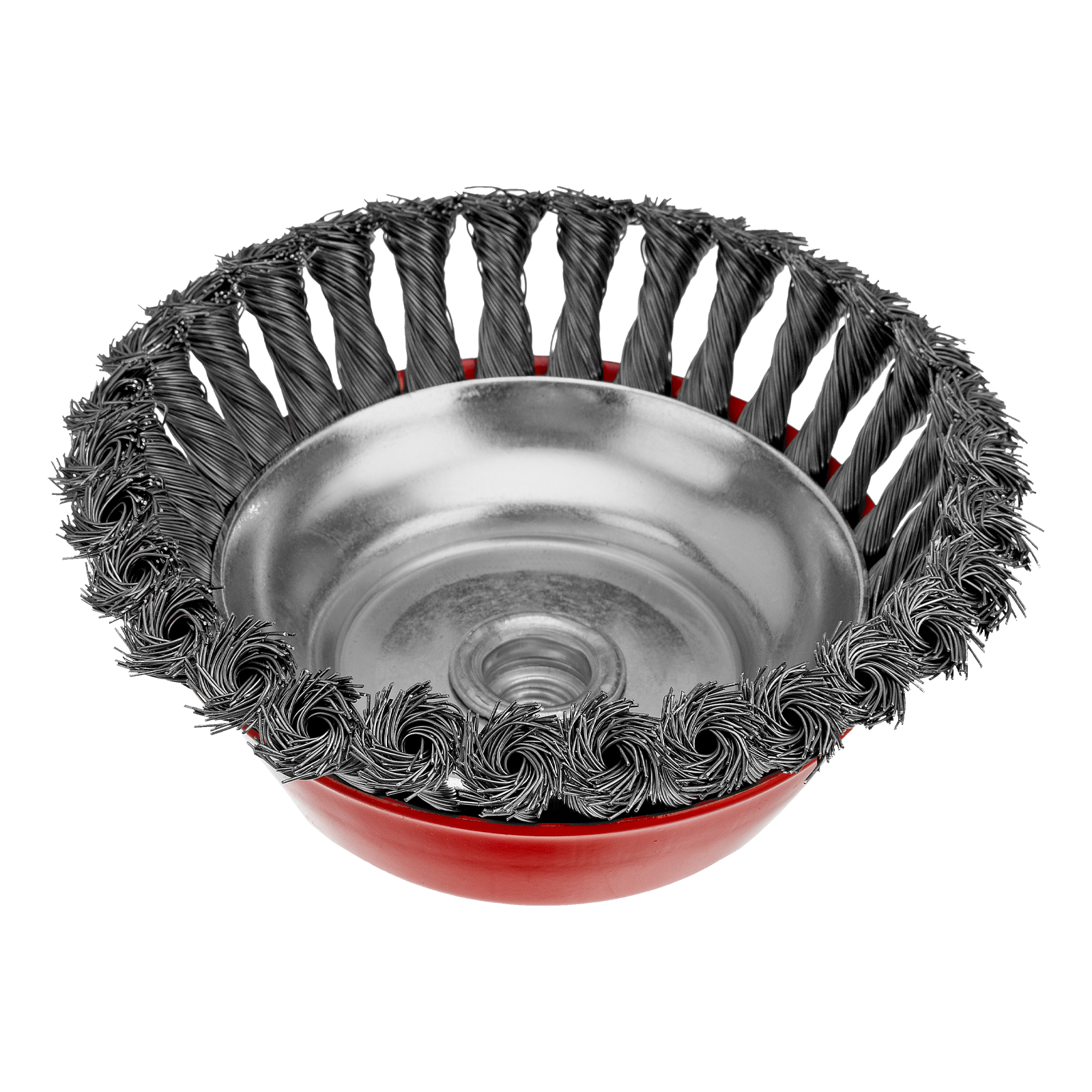 Щетка Matrix «Чашка» 74629 диаметром 150 мм, с присоединительной резьбой М14, с щетиной из крученой проволоки диаметром 0,5 мм, устанавливается на УШМ, поддерживающую работу со скоростью 4500 об/мин. Изделие предназначено для грубой (черновой) обработки поверхностей и подходит для удаления загрязнений, снятия толстого слоя ржавчины, ЛКМ, зачистки сварных швов.