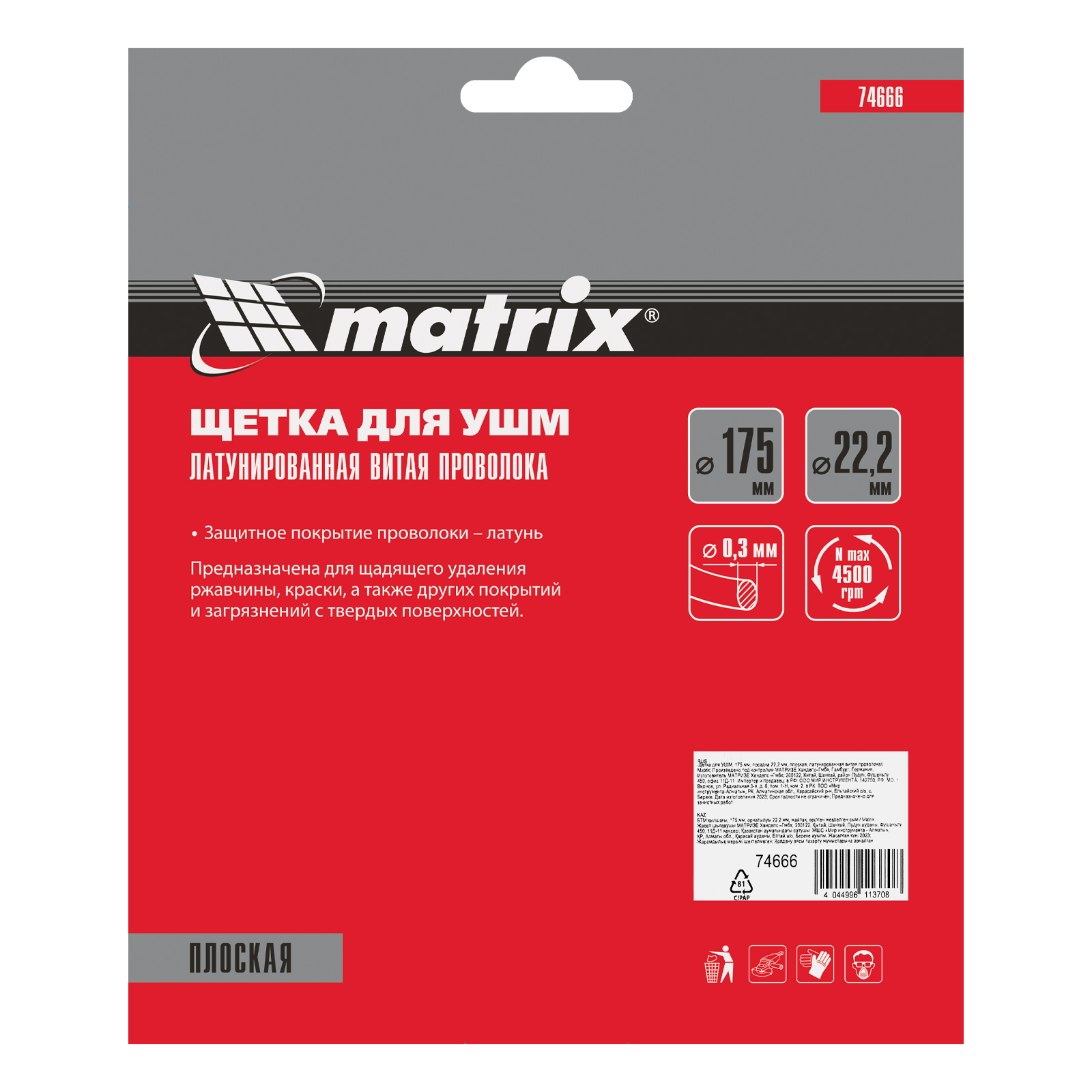 Плоская щетка для УШМ Matrix 74666 диаметром 175 мм, с щетиной из латунированной витой проволоки, посадкой 22,2 мм, предназначена для щадящей обработки поверхностей. Устанавливается на вал УШМ, поддерживающей скорость вращения не более 4500 об/мин. За счет плоской формы эффективно удаляет загрязнения, ржавчину и лакокрасочные покрытия в труднодоступных местах: углах и изгибах.