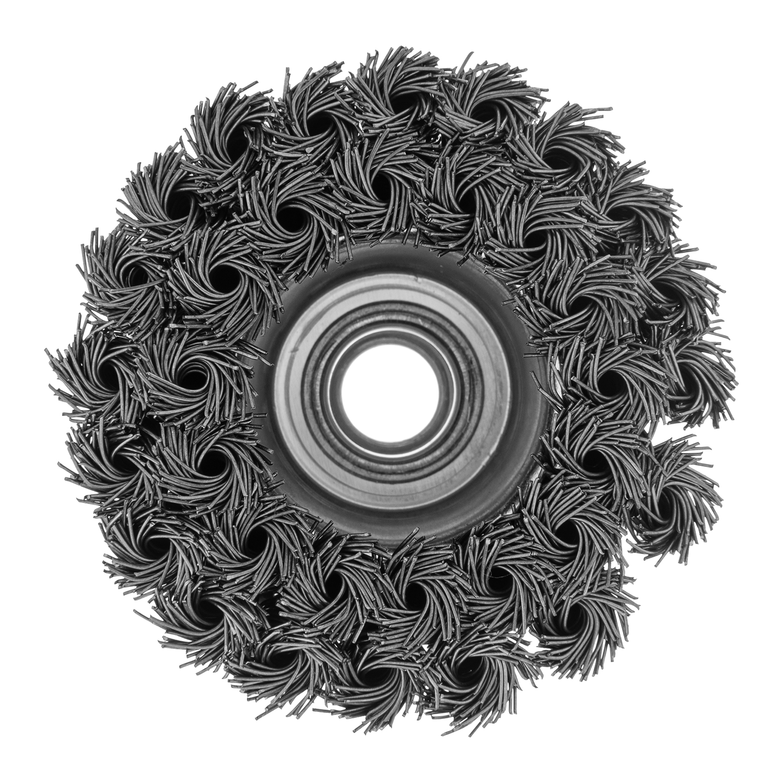 - Универсальность — щеткой можно обрабатывать любые твердые материалы: металл (в том числе цветной), древесину, пластик и т. д.