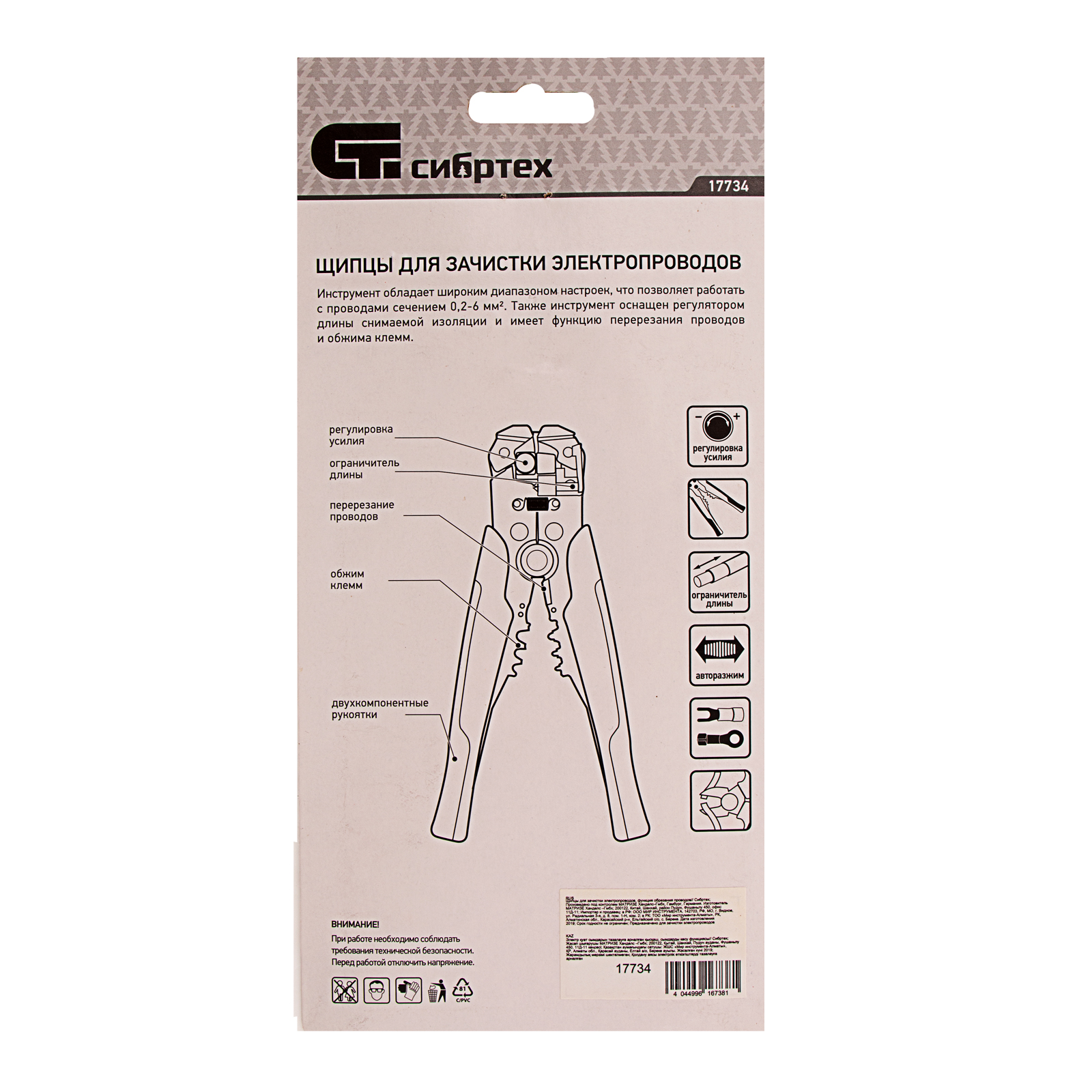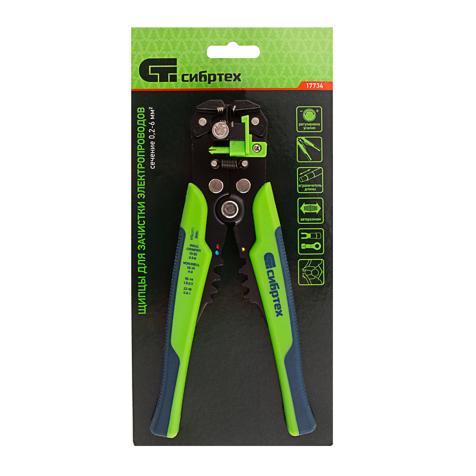 Щипцы Сибртех 17734 рассчитаны на зачистку и снятие изоляции с электропроводов, а также они имеют кусачки для обрезания кабеля. Инструмент станет незаменимым помощником в квартире, гараже, на даче, производстве, строительной площадке во время выполнения электромонтажных работ.