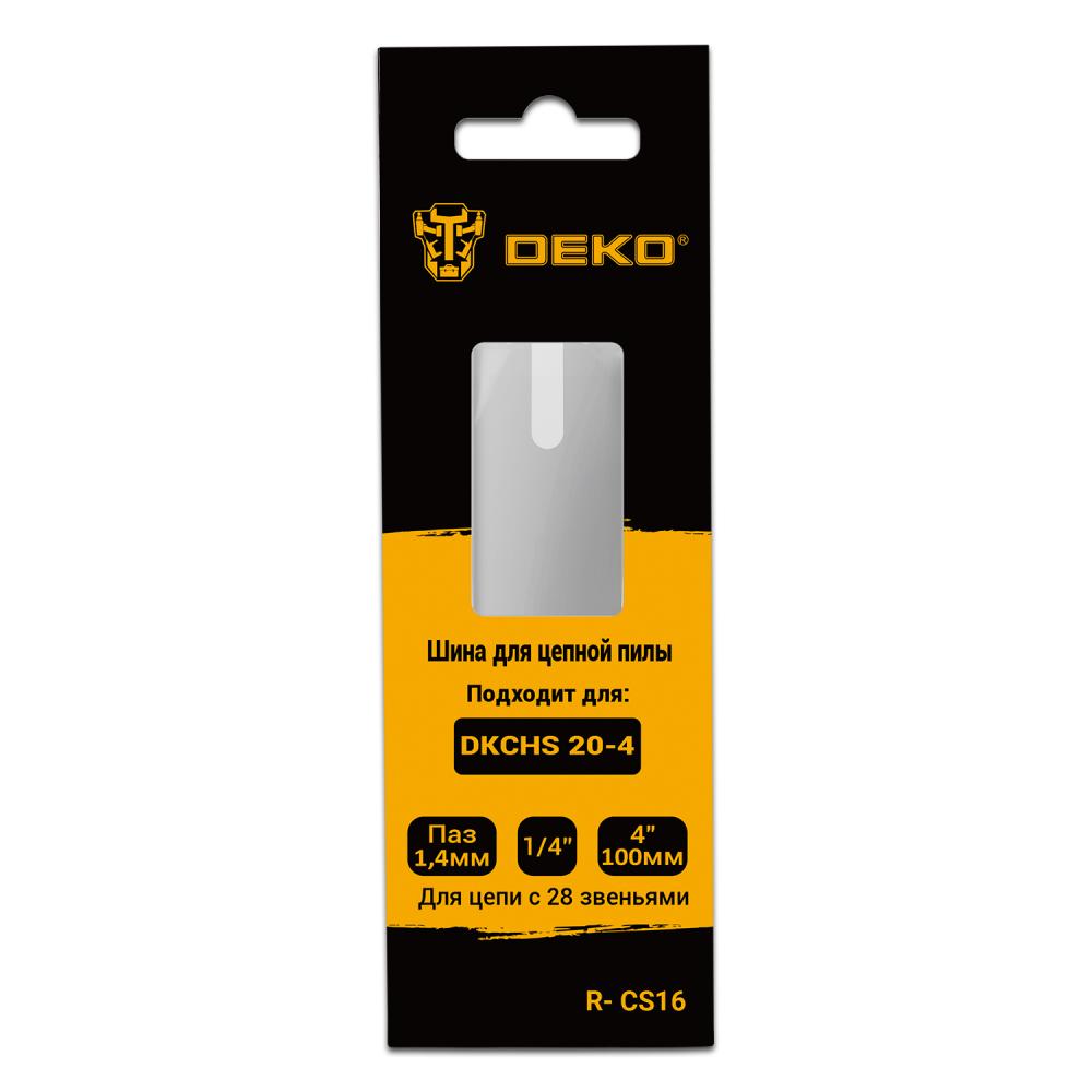 Шина для цепной пилы DEKO R-CS16, 4", 1.4 мм, 28 звеньев подходит для модели DKCHS 20-4. Поставляется в картонной коробке.