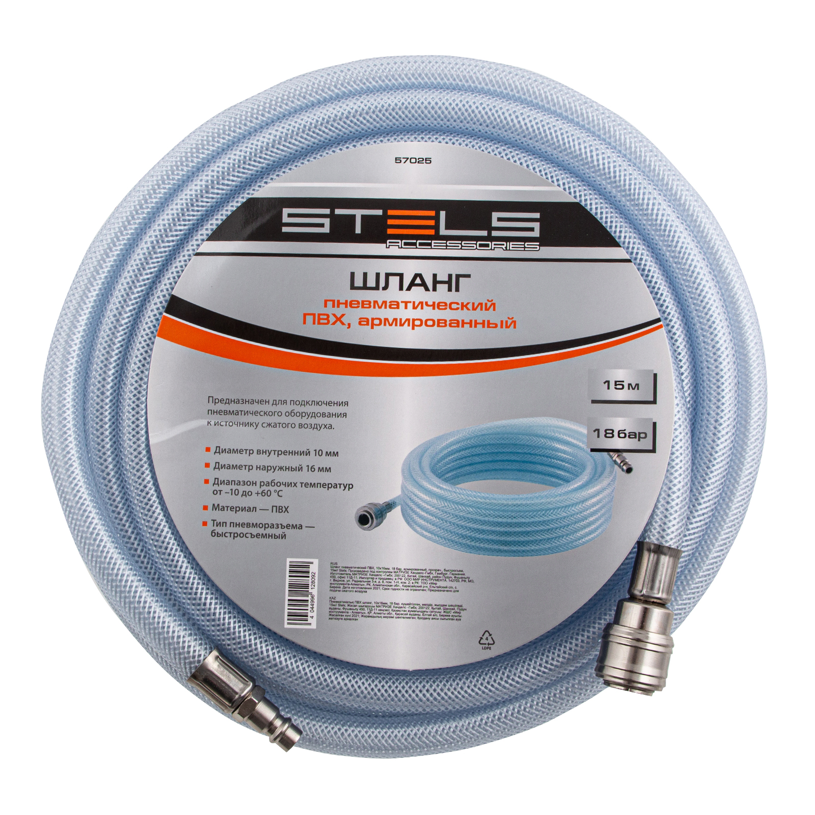 Шланг пневматический ПВХ, 10 x 16 мм, 18 бар, армированный, прозрачный, быстросъемное соединение, 15 м Stels в Воронеже