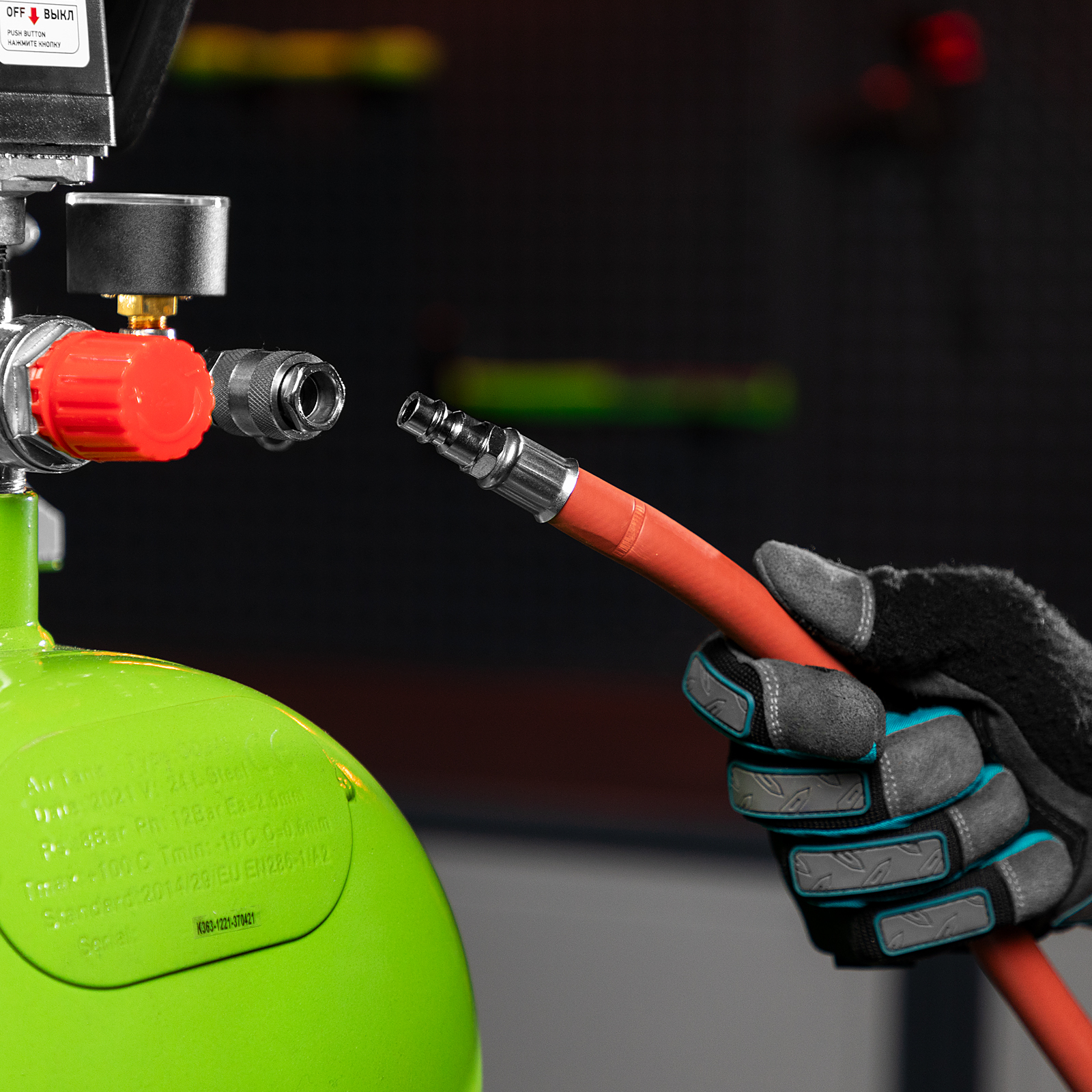- Быстросъемные соединения типа рапид облегчают подключение шланга к компрессору и пневматическим инструментам.