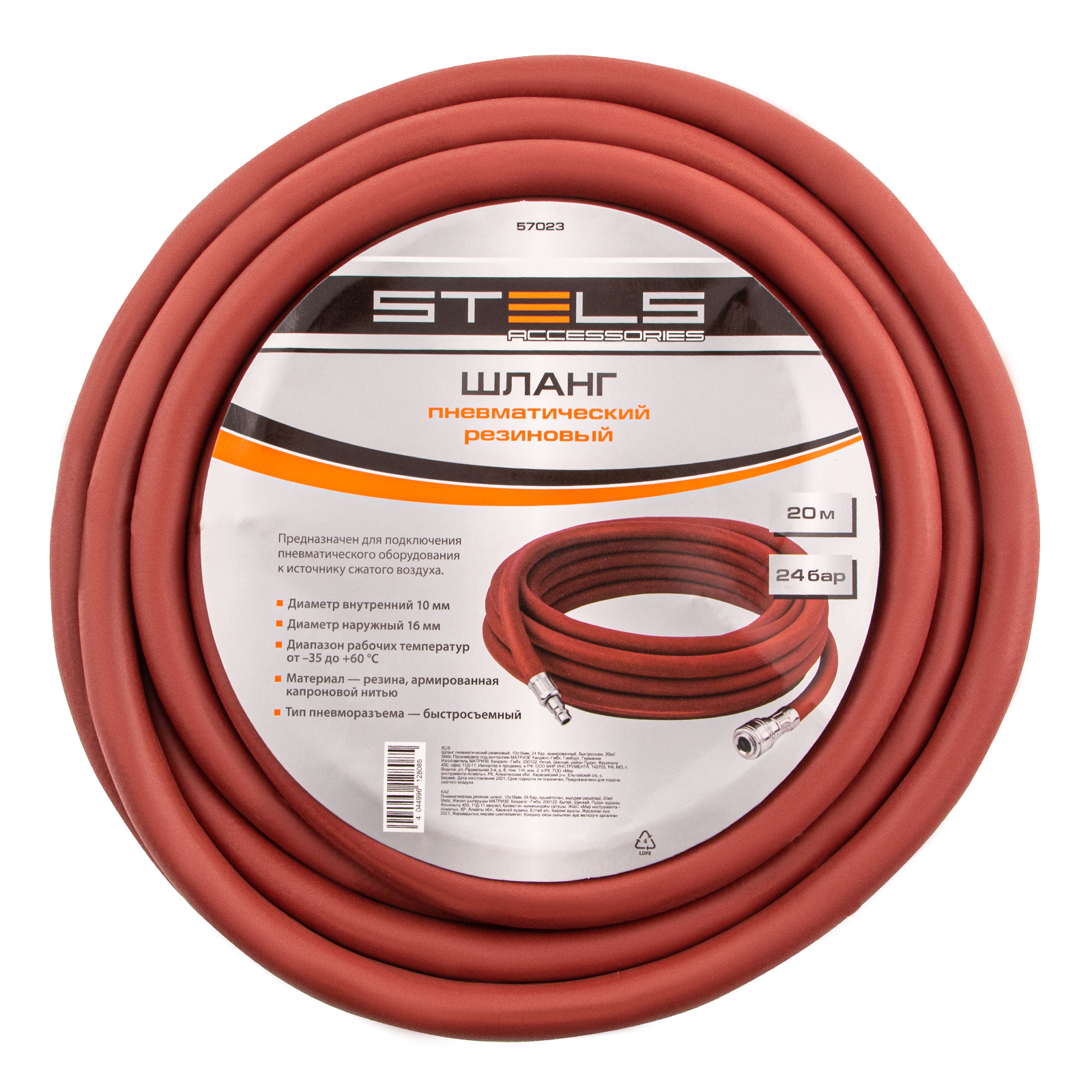 Шланг пневматический резиновый армированный Stels 57023 диаметром 10 х 16 мм, длиной 20 м, с быстросъемными соединениями, служит для подключения пневмоинструмента к компрессору и выдерживает давление до 24 бар. Изготовлен из резины и армирован капроновой нитью, что обеспечивает высокую устойчивость к механическому воздействию и пережатию, а также к перепадам температур. Может использоваться для прокладки воздушной магистрали. Шланг пригодится на производстве, строительной площадке и в автосервисе.