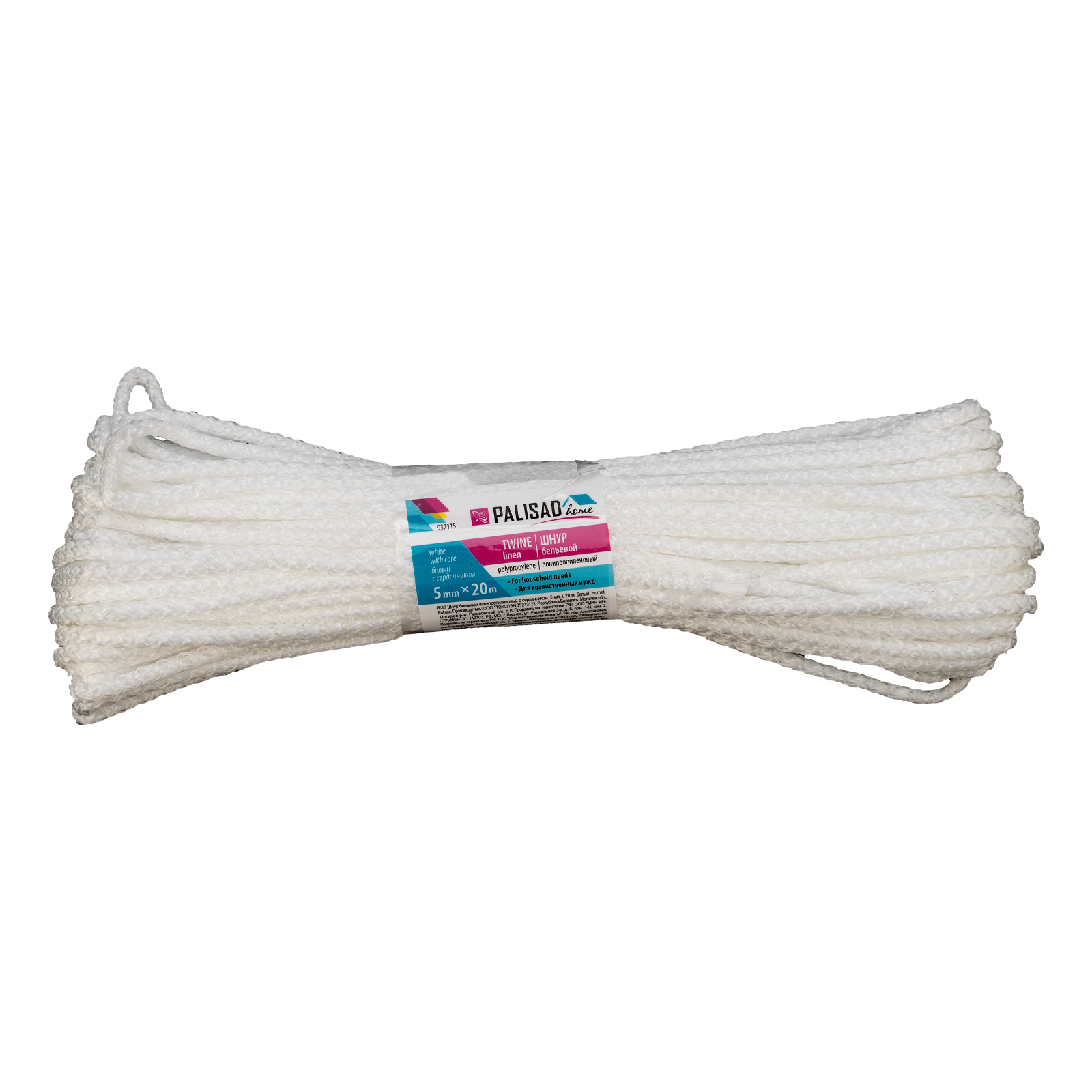 Белый полипропиленовый бельевой шнур Palisad Home 937115 с сердечником, диаметром 5 мм и длиной 20 м, используется для сушки белья, а также в качестве хозяйственной веревки в быту, на рыбалке или в походе. От обычной бельевой веревки для сушки он отличается сердечником из полипропилена, увеличивающим стойкость к нагрузкам. Шнур с полипропиленовой оплеткой выдерживает разрывную нагрузку до 70 кгс, устойчив к растяжению и не провисает под весом мокрых вещей.