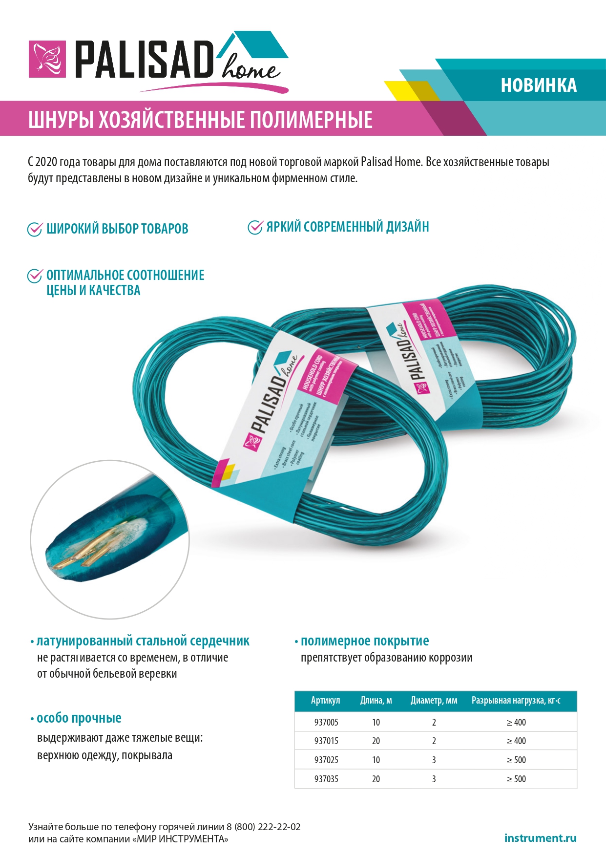 Хозяйственный шнур Palisad Home 937015 с полимерным покрытием, диаметром 2 мм и длиной 20 м, используется для сушки белья, связывания предметов и решения других задач. Будет полезен дома, на даче, в походе. В качестве сердечника использована стальная латунированная проволока, поэтому шнур не растягивается со временем.