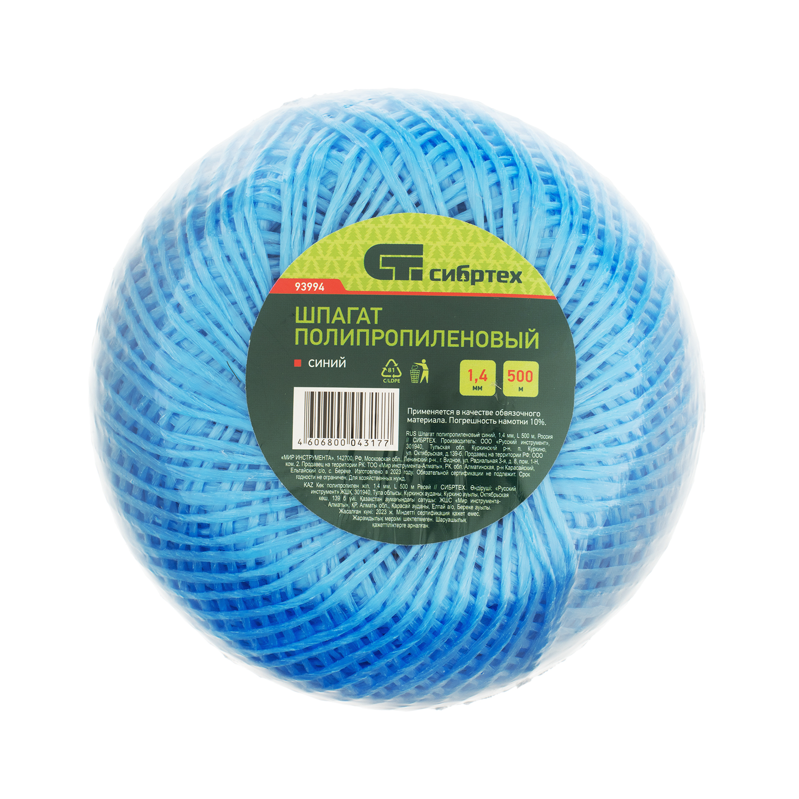Шпагат полипропиленовый синий, 1.4 мм, L 500 м, Сибртех в Воронеже
